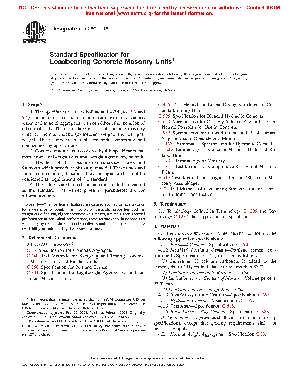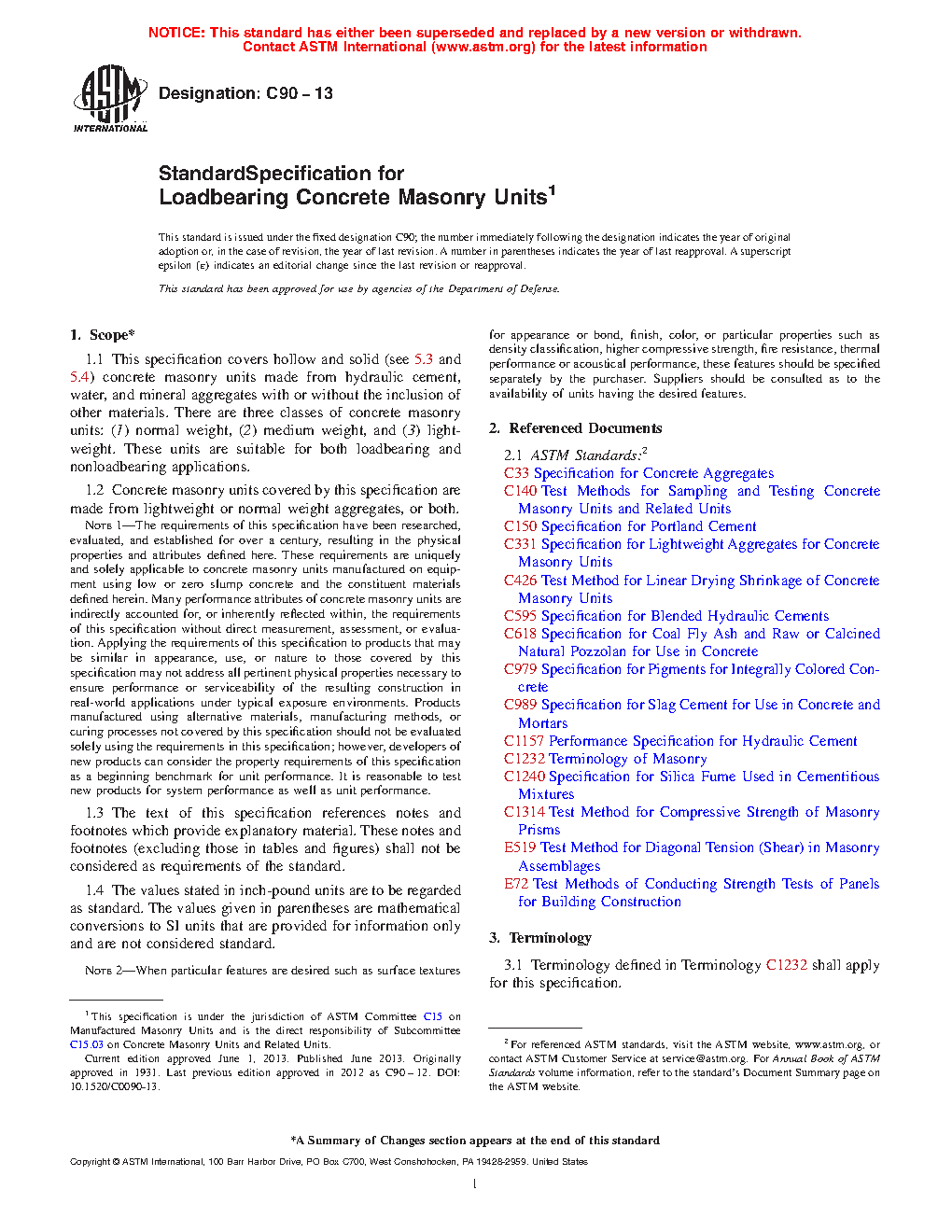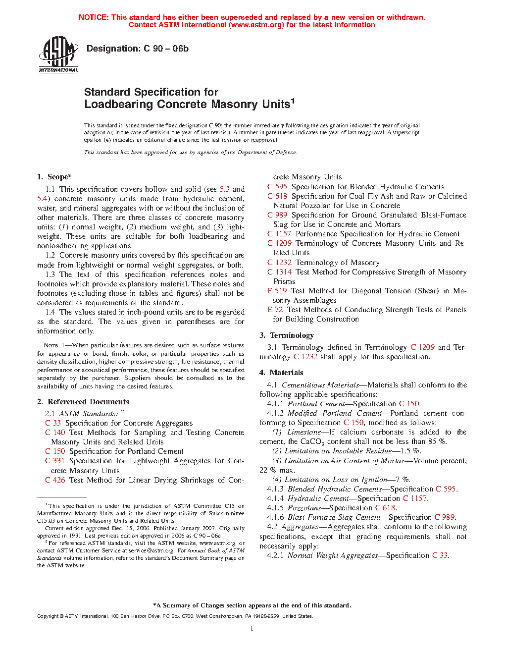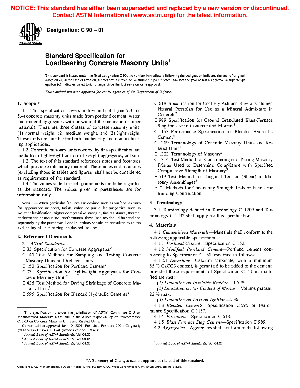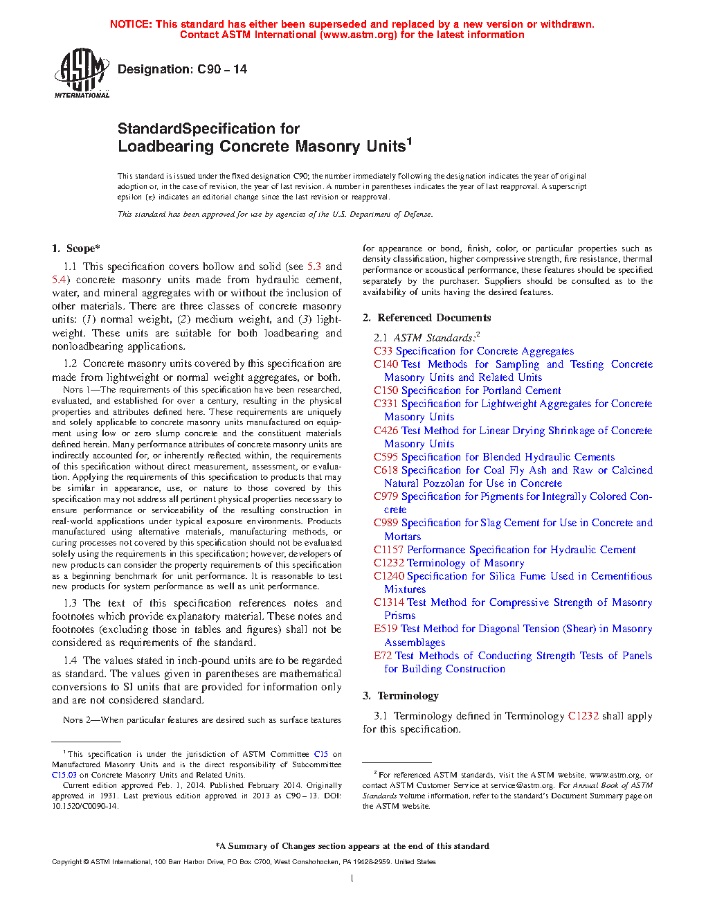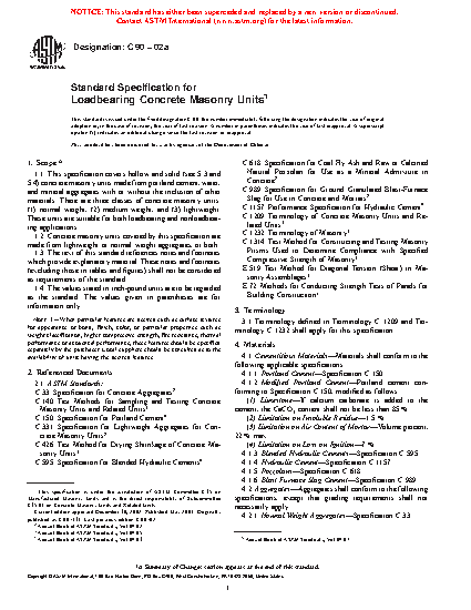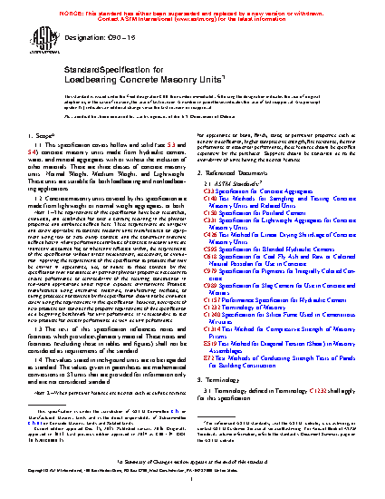 1.1 This specification covers hollow and solid (see 5.3 and 5.4) concrete masonry units made from hydraulic cement, water, and mineral aggregates with or without the inclusion of other materials. There are three classes of concrete masonry units: Normal Weight, Medium Weight, and Lightweight. These units are suitable for both loadbearing and nonloadbearing applications.