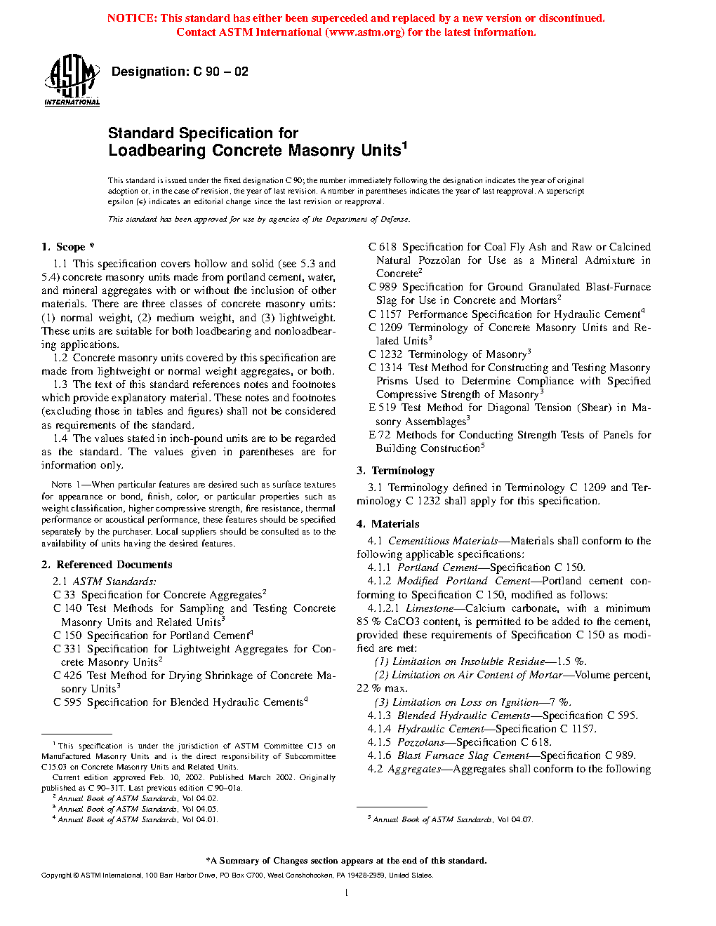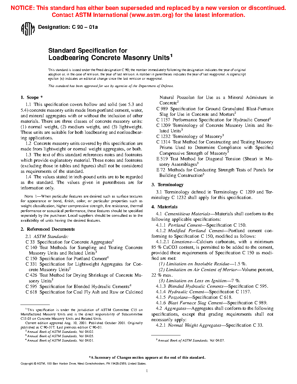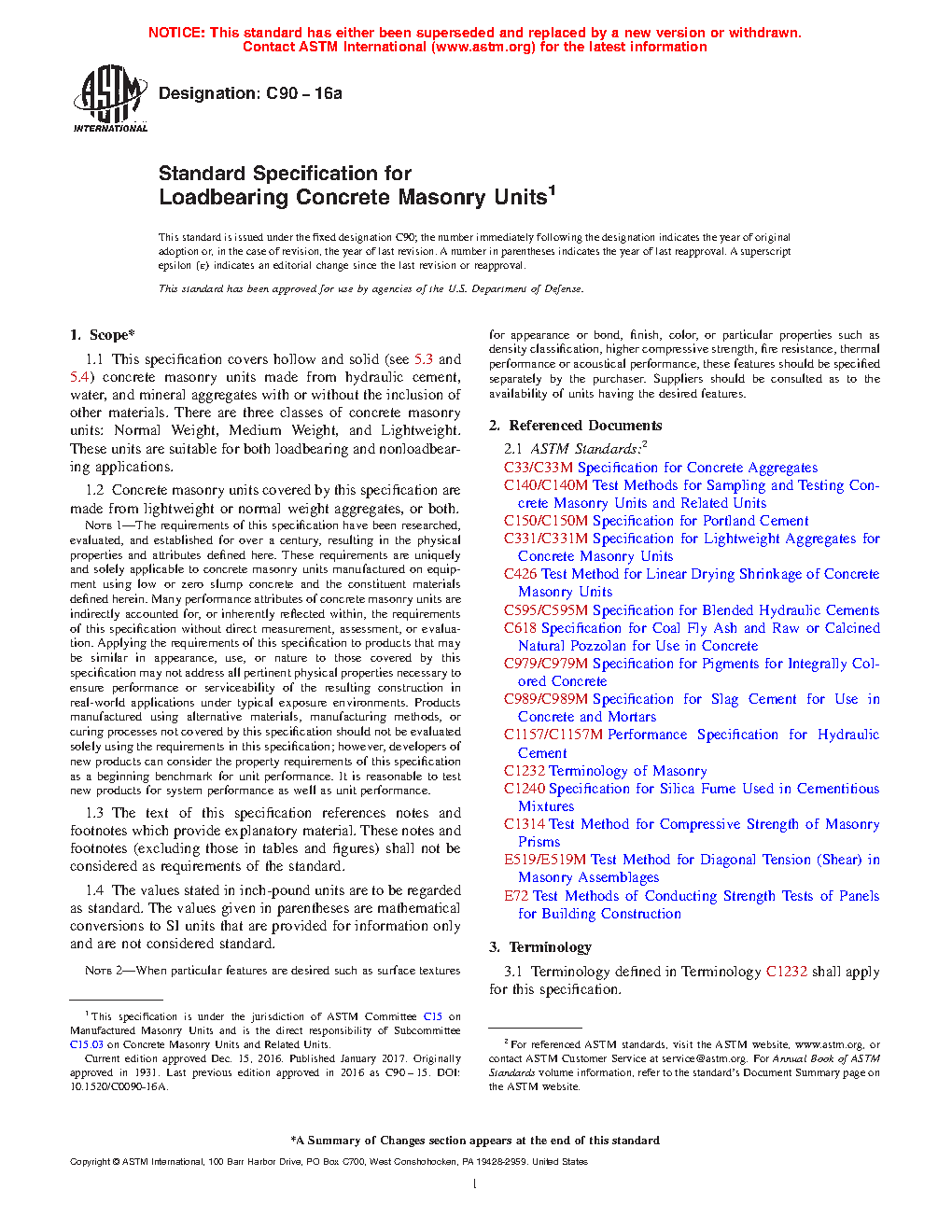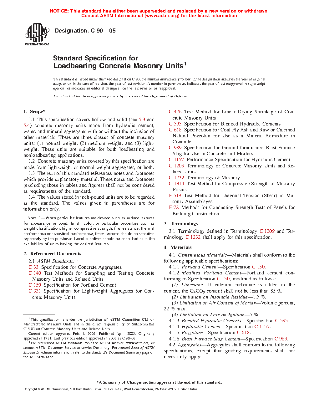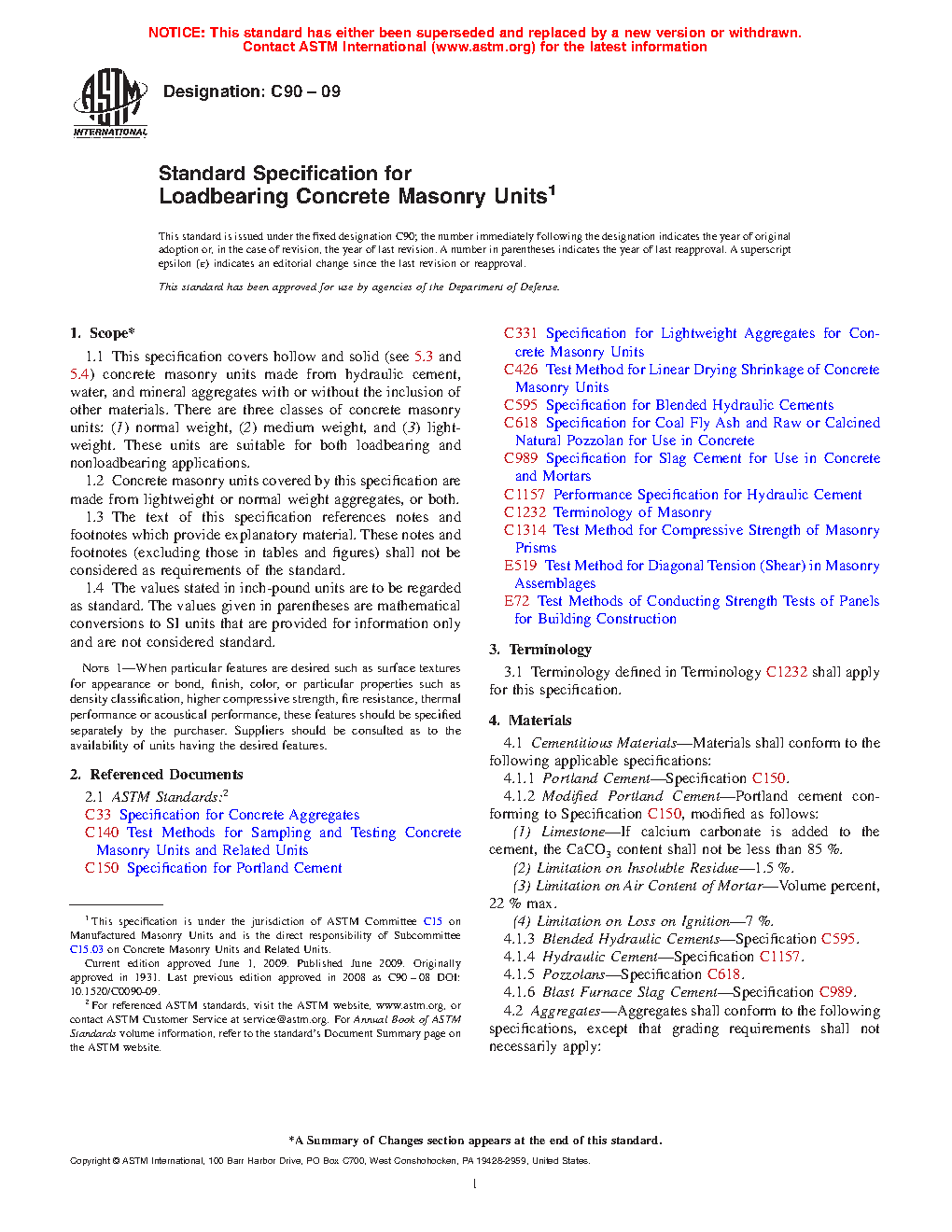 1.1 This specification covers hollow and solid (see 5.3 and 5.4) concrete masonry units made from hydraulic cement, water, and mineral aggregates with or without the inclusion of other materials. There are three classes of concrete masonry units: Normal Weight, Medium Weight, and Lightweight. These units are suitable for both loadbearing and nonloadbearing applications.