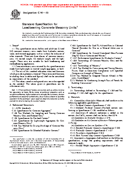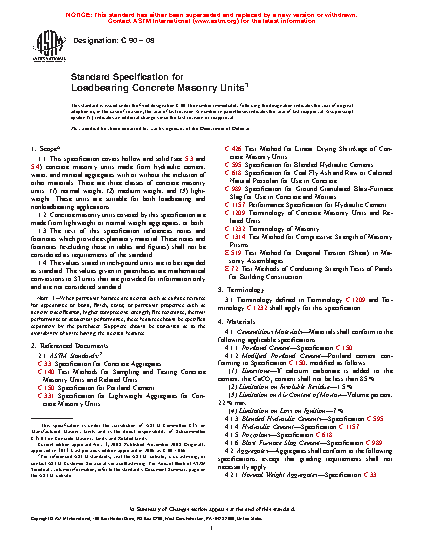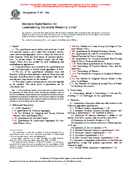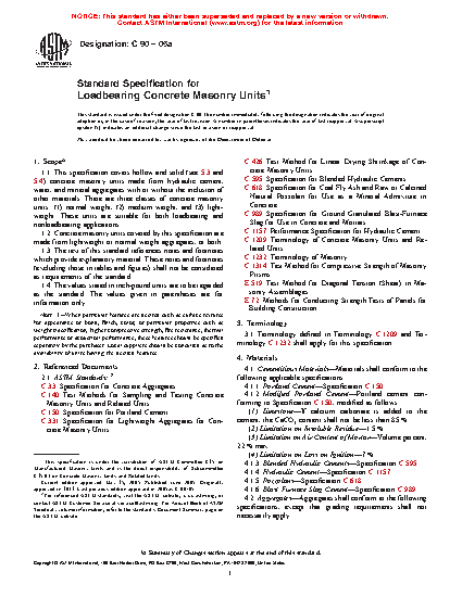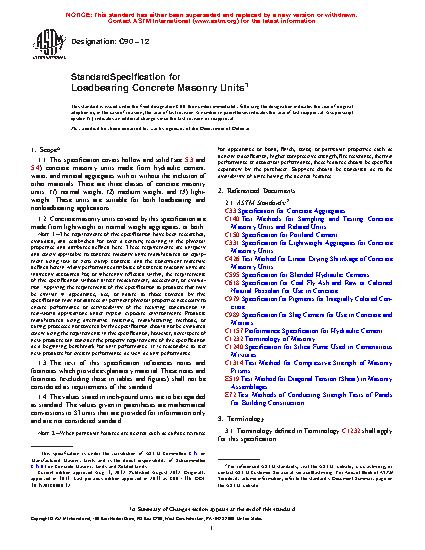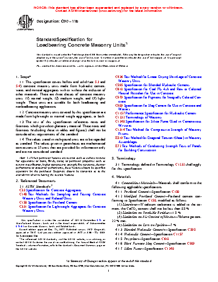 This specification covers hollow and solid concrete masonry units made from hydraulic cement, water, and mineral aggregates with or without the inclusion of other materials. There are three classes of concrete masonry units: normal weight, medium weight, and lightweight. These units are suitable for both loadbearing and nonloadbearing applications. Concrete masonry units shall be made from lightweight or normal weight aggregates, or both.