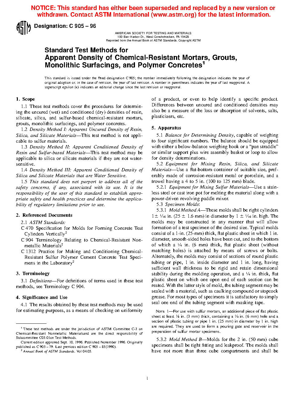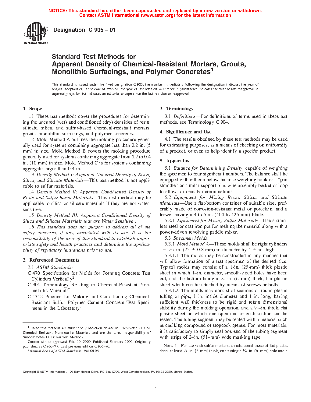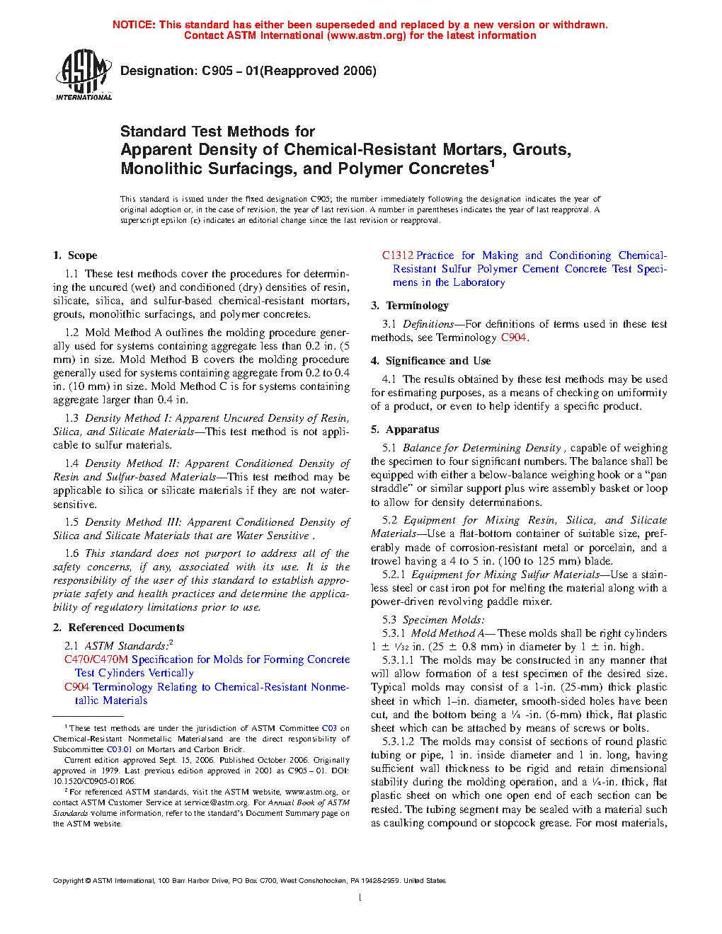 1.1 These test methods cover the procedures for determining the uncured (wet) and conditioned (dry) densities of resin, silicate, silica, and sulfur-based chemical-resistant mortars, grouts, monolithic surfacings, and polymer concretes.