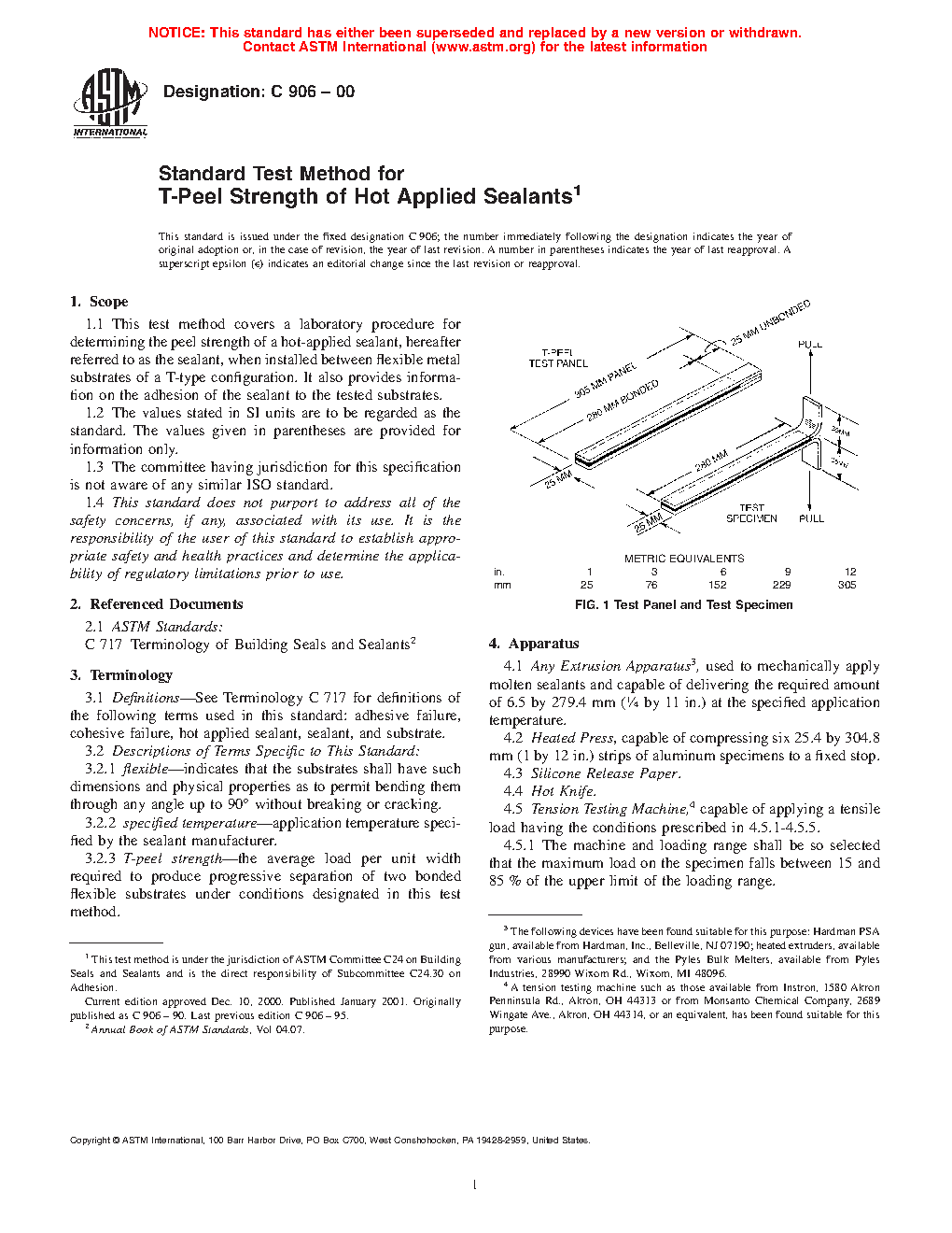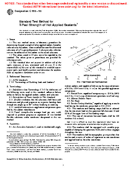1.1 This test method covers a laboratory procedure for determining the peel strength of a hot-applied sealant, hereafter referred to as the sealant, when installed between flexible metal substrates of a T-type configuration. It also provides information on the adhesion of the sealant to the tested substrates.