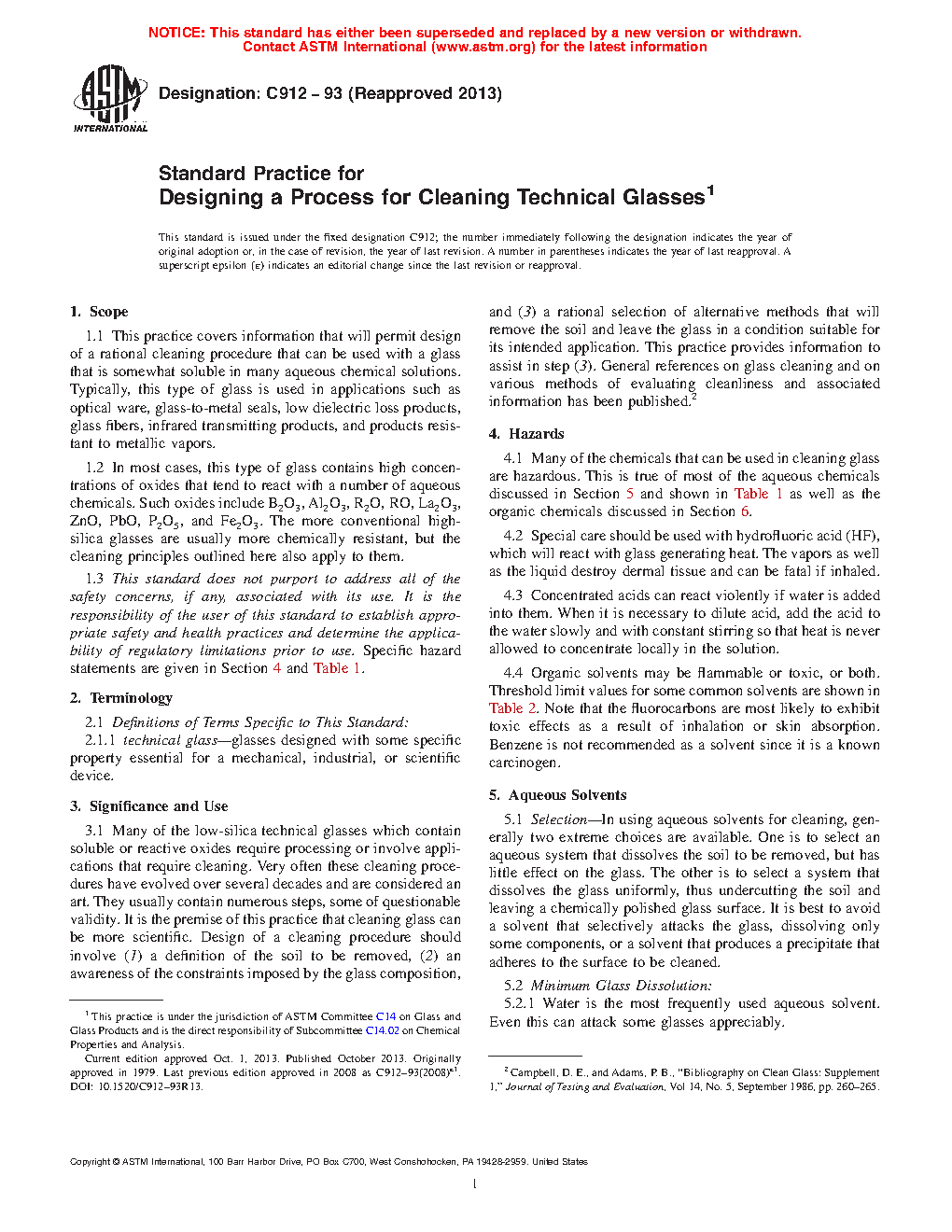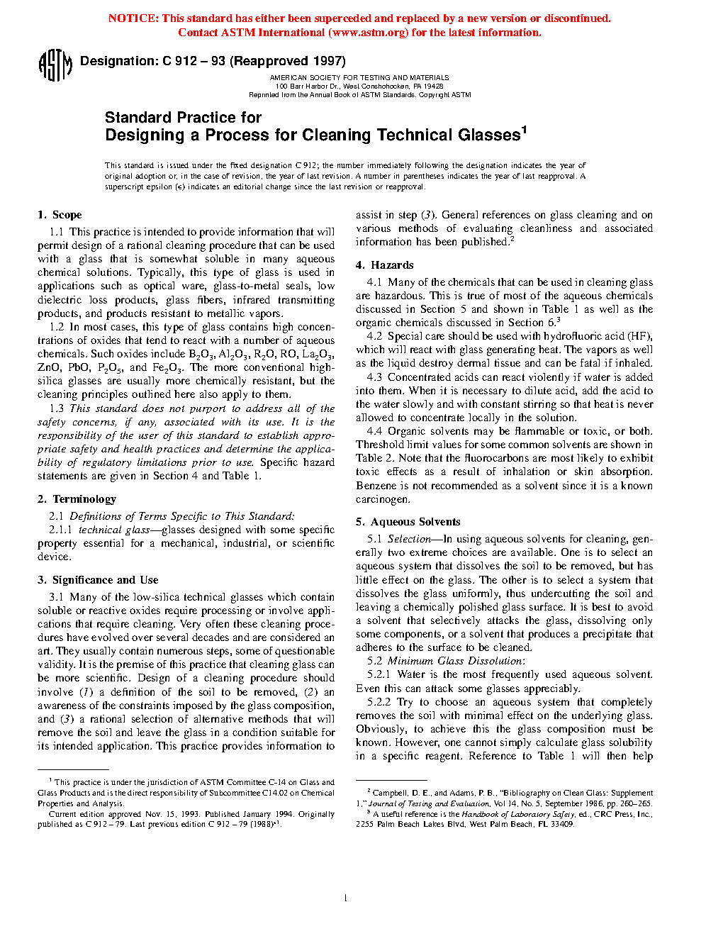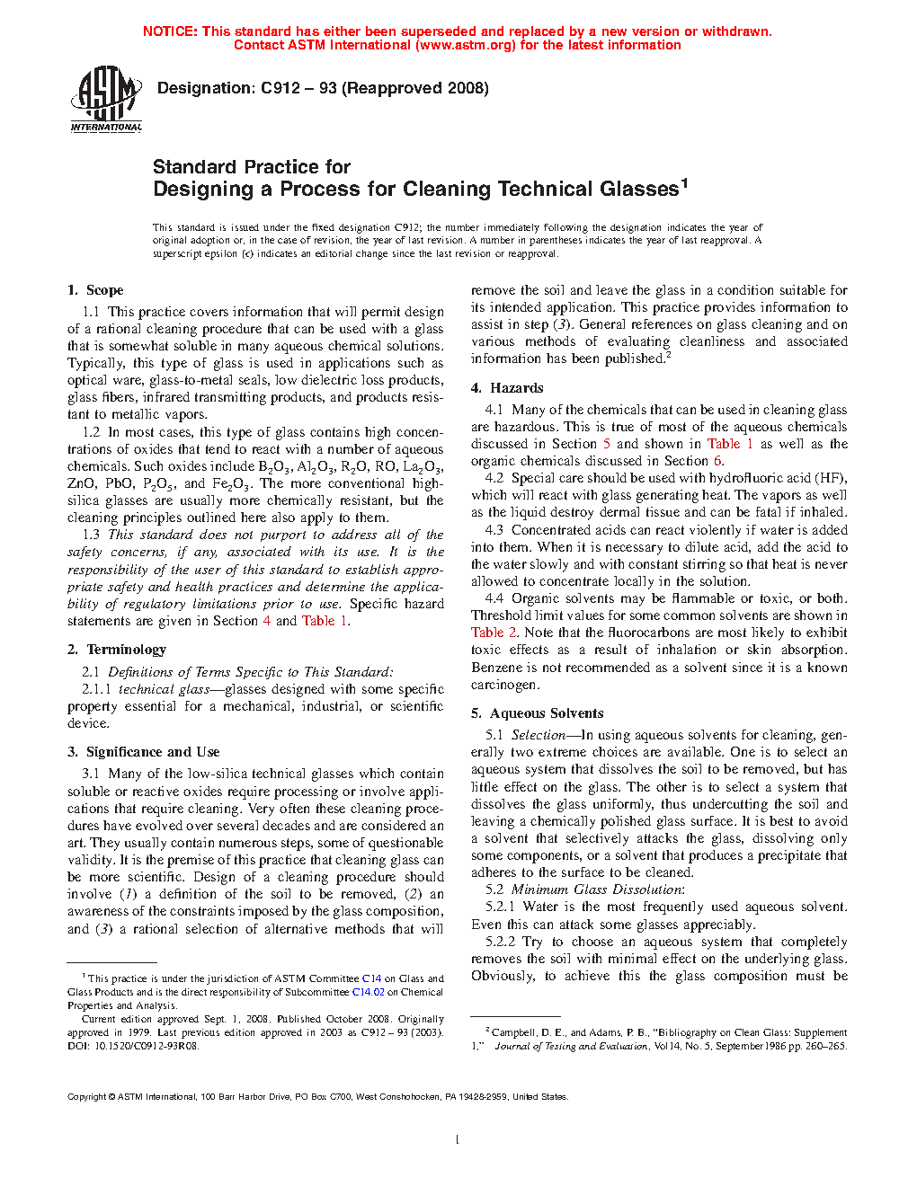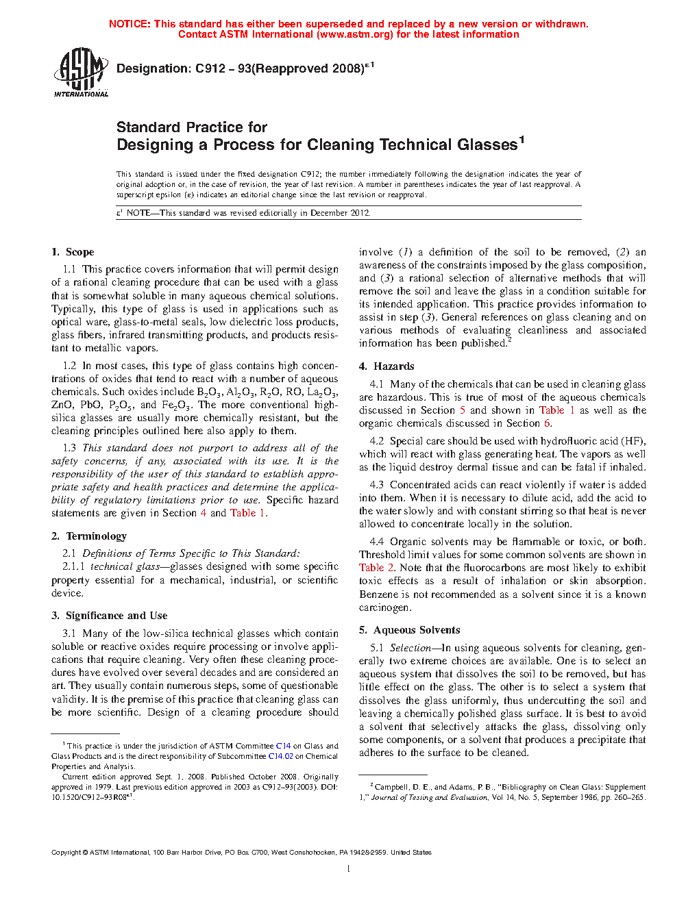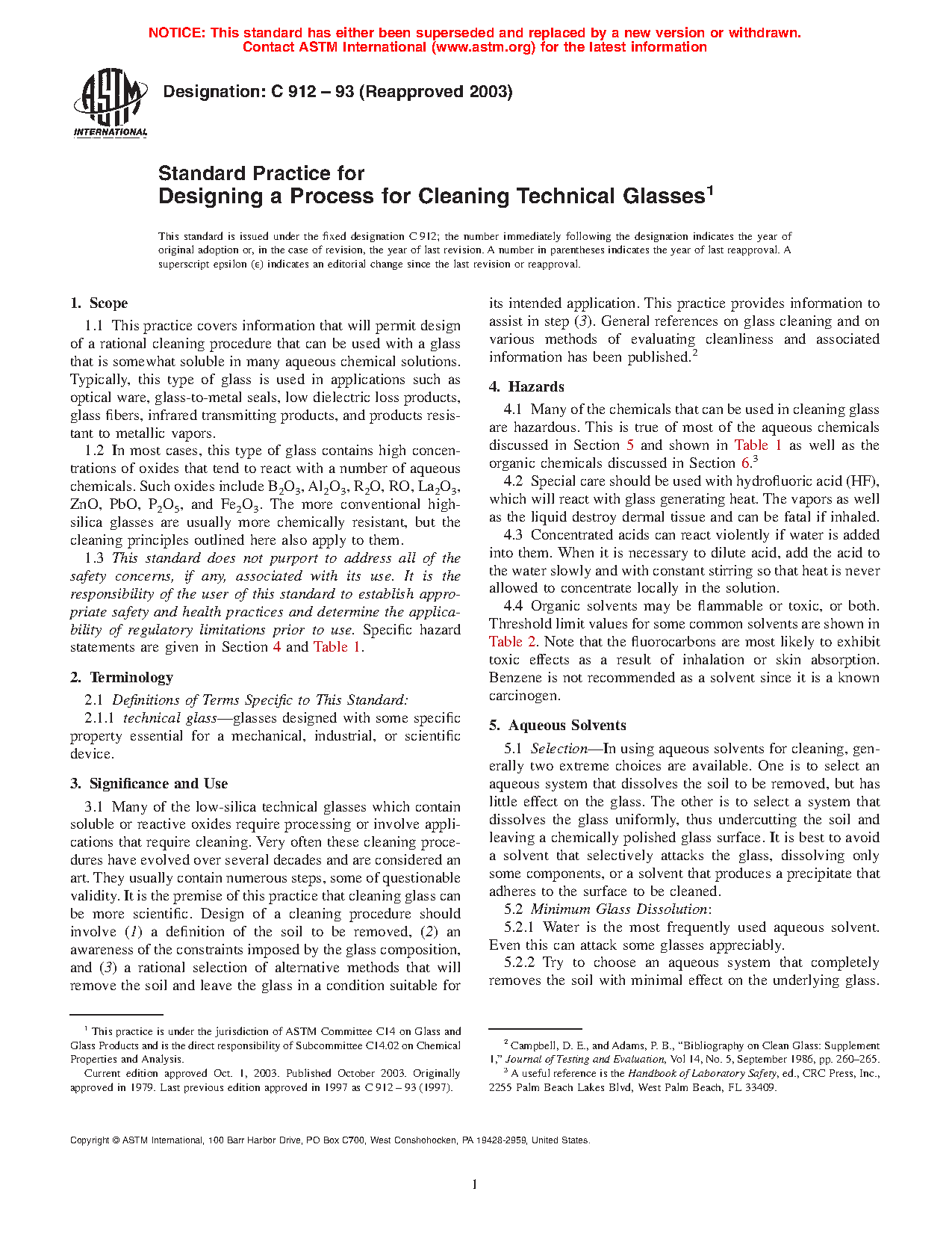 3.1 Many of the low-silica technical glasses which contain soluble or reactive oxides require processing or involve applications that require cleaning. Very often these cleaning procedures have evolved over several decades and are considered an art. They usually contain numerous steps, some of questionable validity. It is the premise of this practice that cleaning glass can be more scientific. Design of a cleaning procedure should involve (1) a definition of the soil to be removed, (2) an awareness of the constraints imposed by the glass composition, and (3) a rational selection of alternative methods that will remove the soil and leave the glass in a condition suitable for its intended application. This practice provides information to assist in step (3). General references on glass cleaning and on various methods of evaluating cleanliness and associated information has been published.2