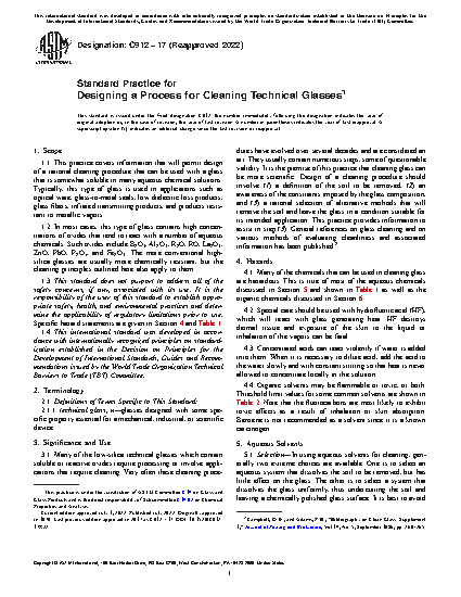 1.1 This practice covers information that will permit design of a rational cleaning procedure that can be used with a glass that is somewhat soluble in many aqueous chemical solutions. Typically, this type of glass is used in applications such as optical ware, glass-to-metal seals, low dielectric loss products, glass fibers, infrared transmitting products, and products resistant to metallic vapors.