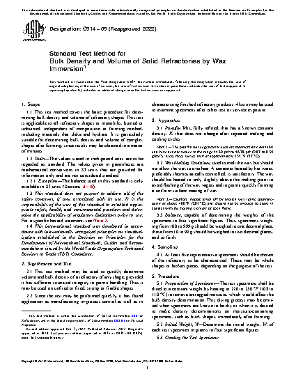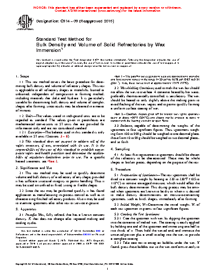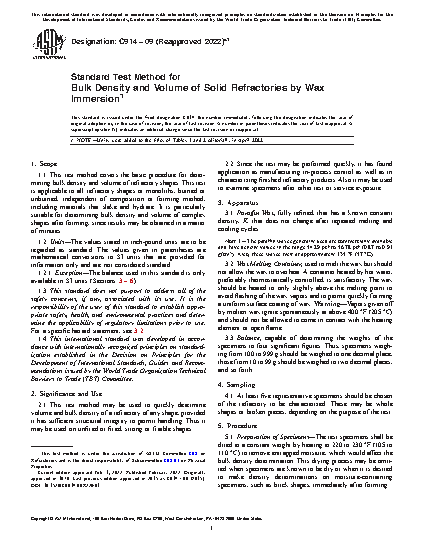 1.1 This test method covers the basic procedure for determining bulk density and volume of refractory shapes. This test is applicable to all refractory shapes or monoliths, burned or unburned, independent of composition or forming method, including materials that slake and hydrate. It is particularly suitable for determining bulk density and volume of complex shapes after forming, since results may be obtained in a matter of minutes.