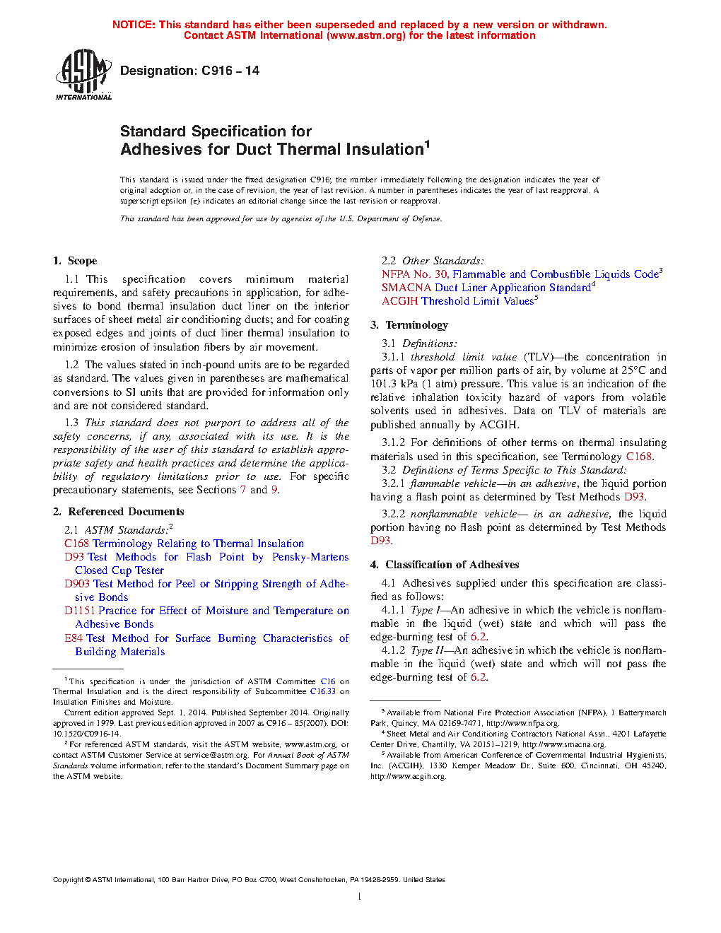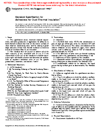 1.1 This specification covers minimum material requirements, and safety precautions in application, for adhesives to bond thermal insulation duct liner on the interior surfaces of sheet metal air conditioning ducts; and for coating exposed edges and joints of duct liner thermal insulation to minimize erosion of insulation fibers by air movement.