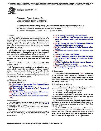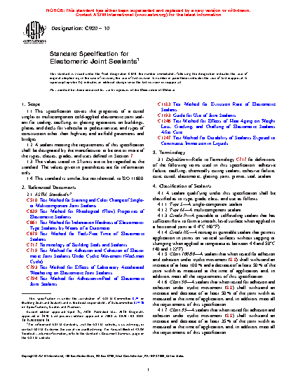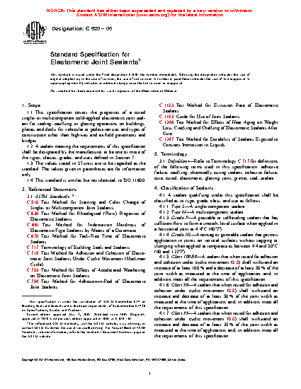 1.1 This ASTM specification covers the properties of a cured single- or multicomponent cold-applied elastomeric joint sealant for sealing, caulking, or glazing operations on buildings, plazas, and decks for vehicular or pedestrian use, and types of construction other than highway and airfield pavements and bridges.