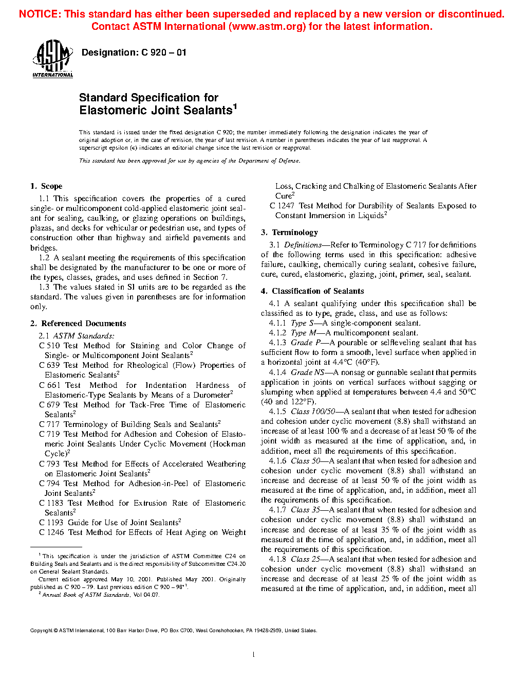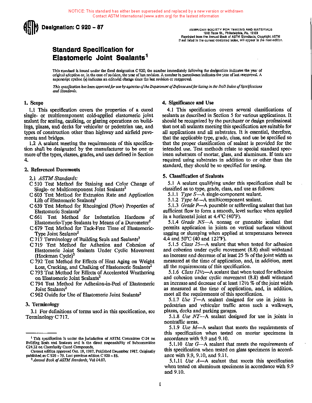 1.2 A sealant meeting the requirements of this specification shall be designated by the manufacturer to be one or more of the types, classes, grades, and uses defined in Section 7.