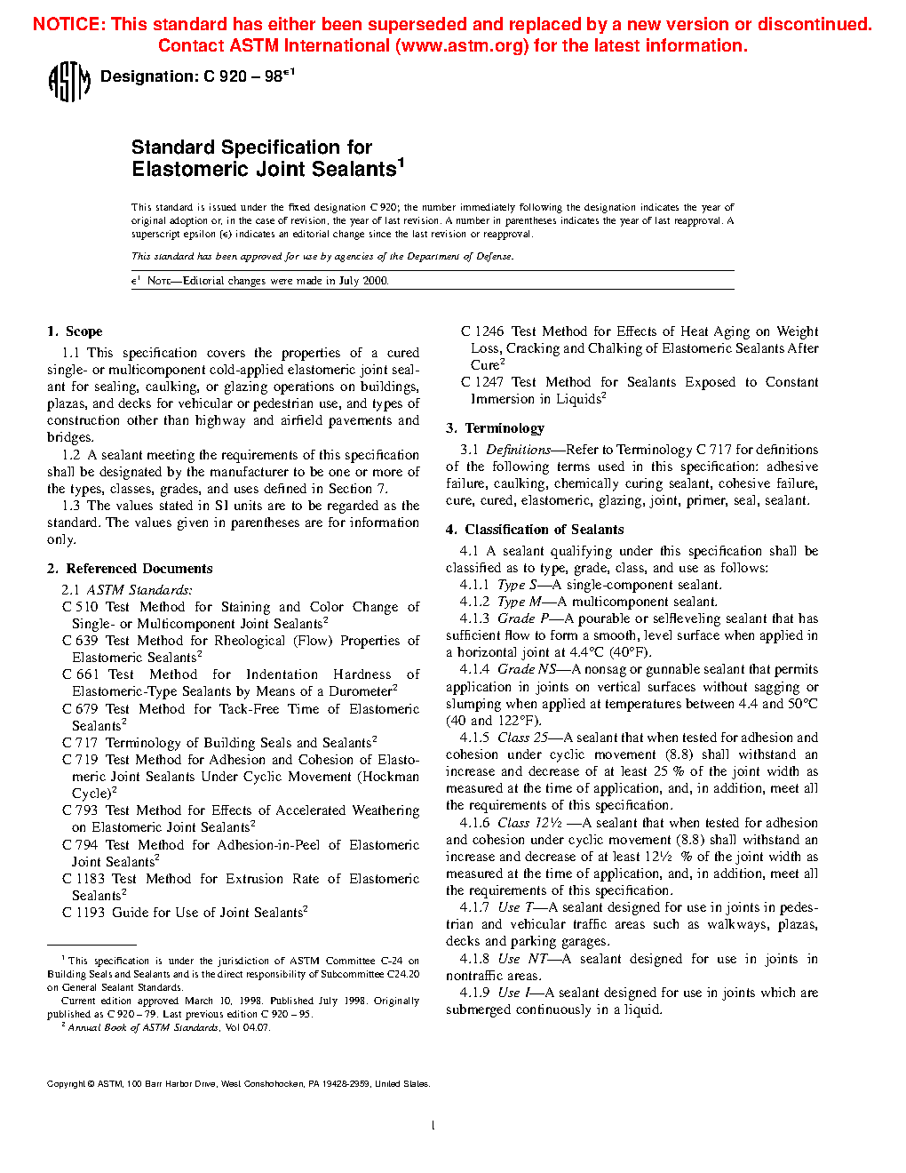 7.1 This specification covers several classifications of sealants as described in Section 4 for various applications. It should be recognized by the purchaser or design professional that not all sealants meeting this specification are suitable for all applications and all substrates. It is essential, therefore, that the applicable type, grade, class, and use be specified so that the proper classification of sealant is provided for the intended use. Test methods relate to special standard specimen substrates of mortar, glass, and aluminum. If tests are required using substrates in addition to or other than the standard, they should be so specified for testing.