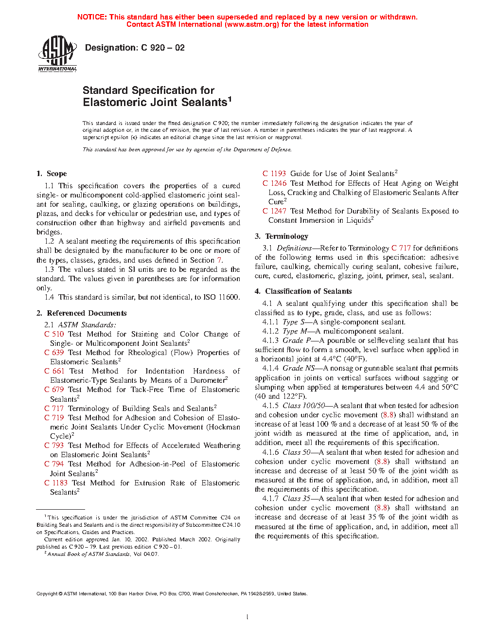 1.2 A sealant meeting the requirements of this specification shall be designated by the manufacturer to be one or more of the types, classes, grades, and uses defined in Section 7.