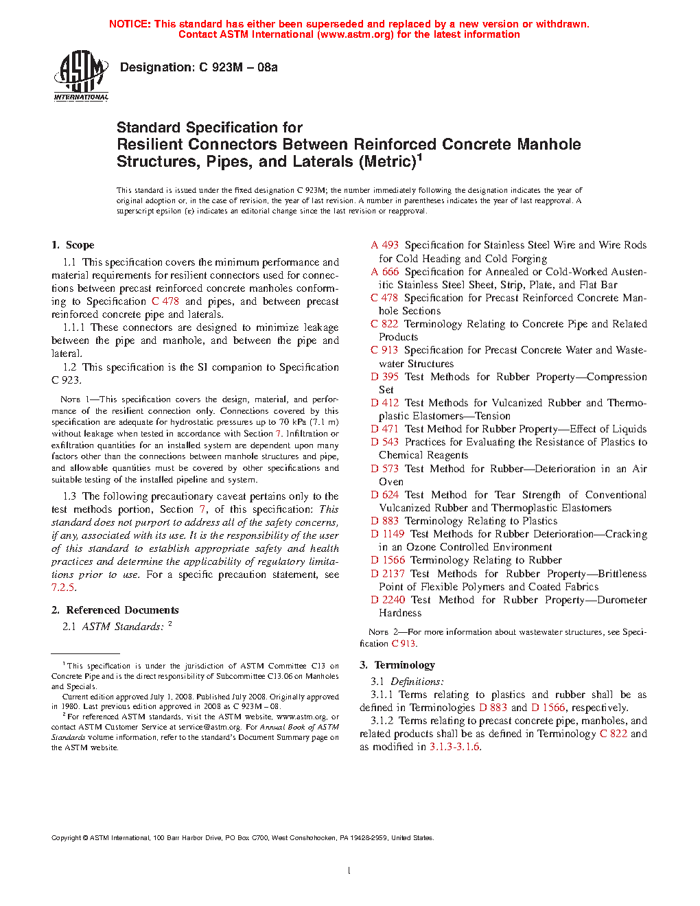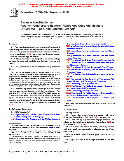 1.1 This specification covers the minimum performance and material requirements for resilient connectors used for connections between precast reinforced concrete manholes conforming to Specification C478 and pipes, and between precast reinforced concrete pipe and laterals.