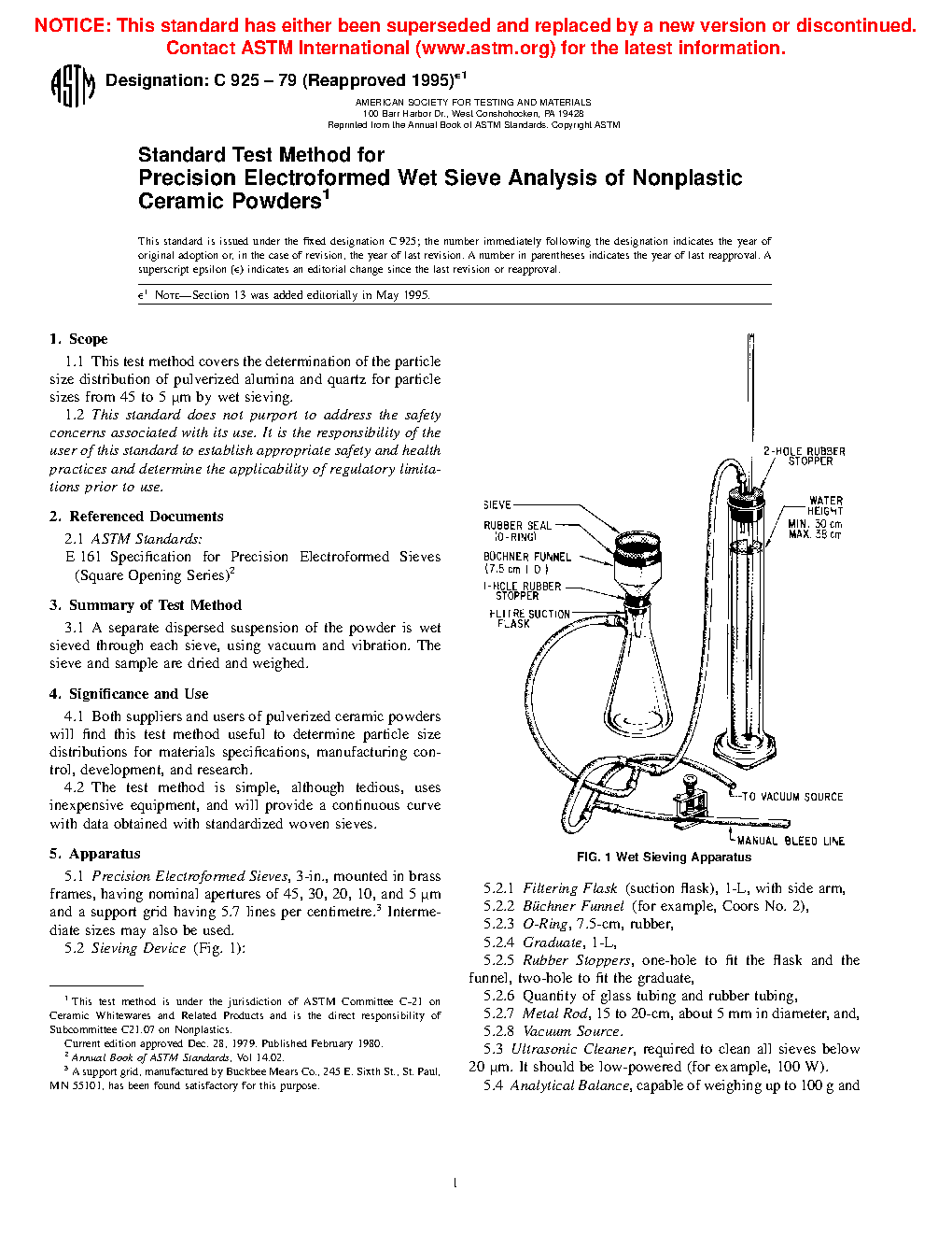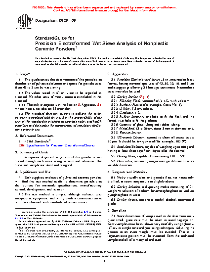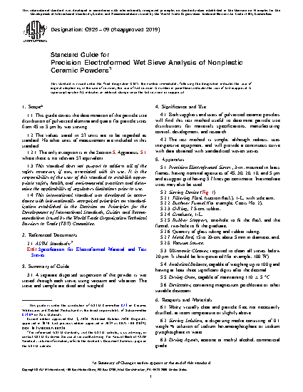 1.1 This guide covers the determination of the particle size distribution of pulverized alumina and quartz for particle sizes from 45 to 5 μm by wet sieving.