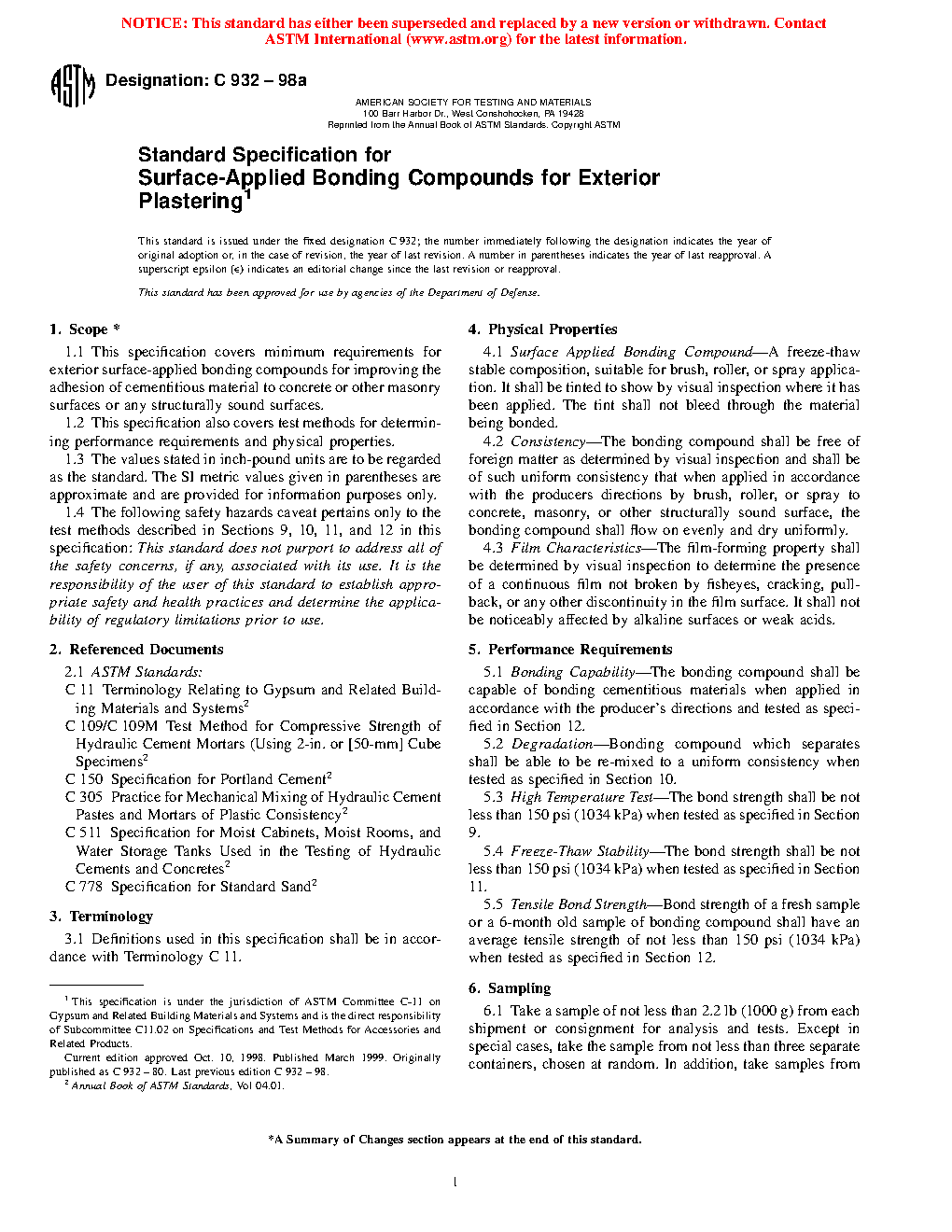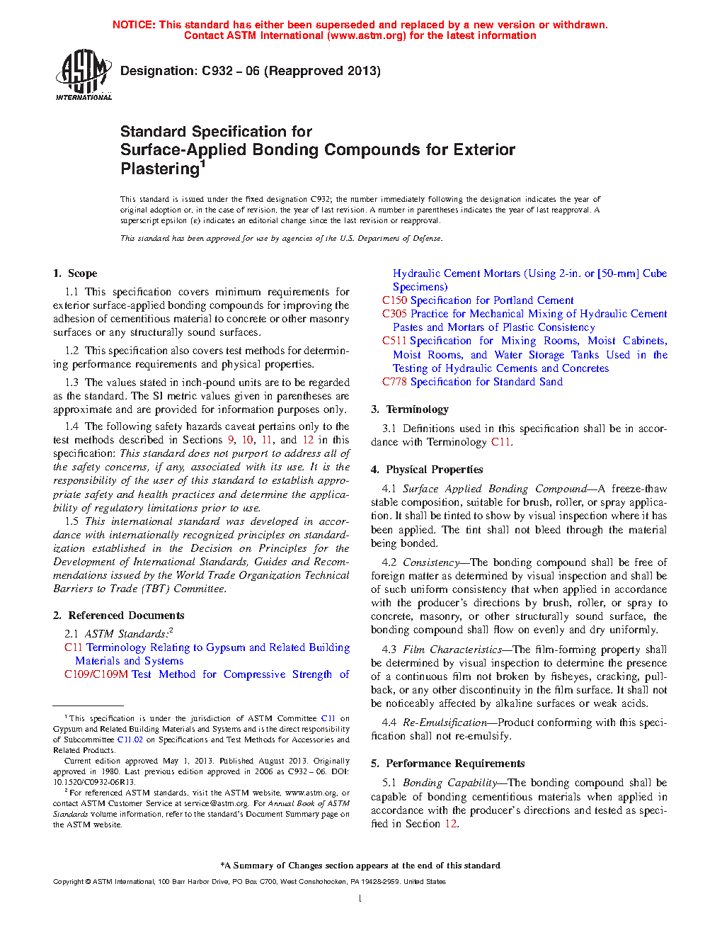 1.1 This specification covers minimum requirements for exterior surface-applied bonding compounds for improving the adhesion of cementitious material to concrete or other masonry surfaces or any structurally sound surfaces.
