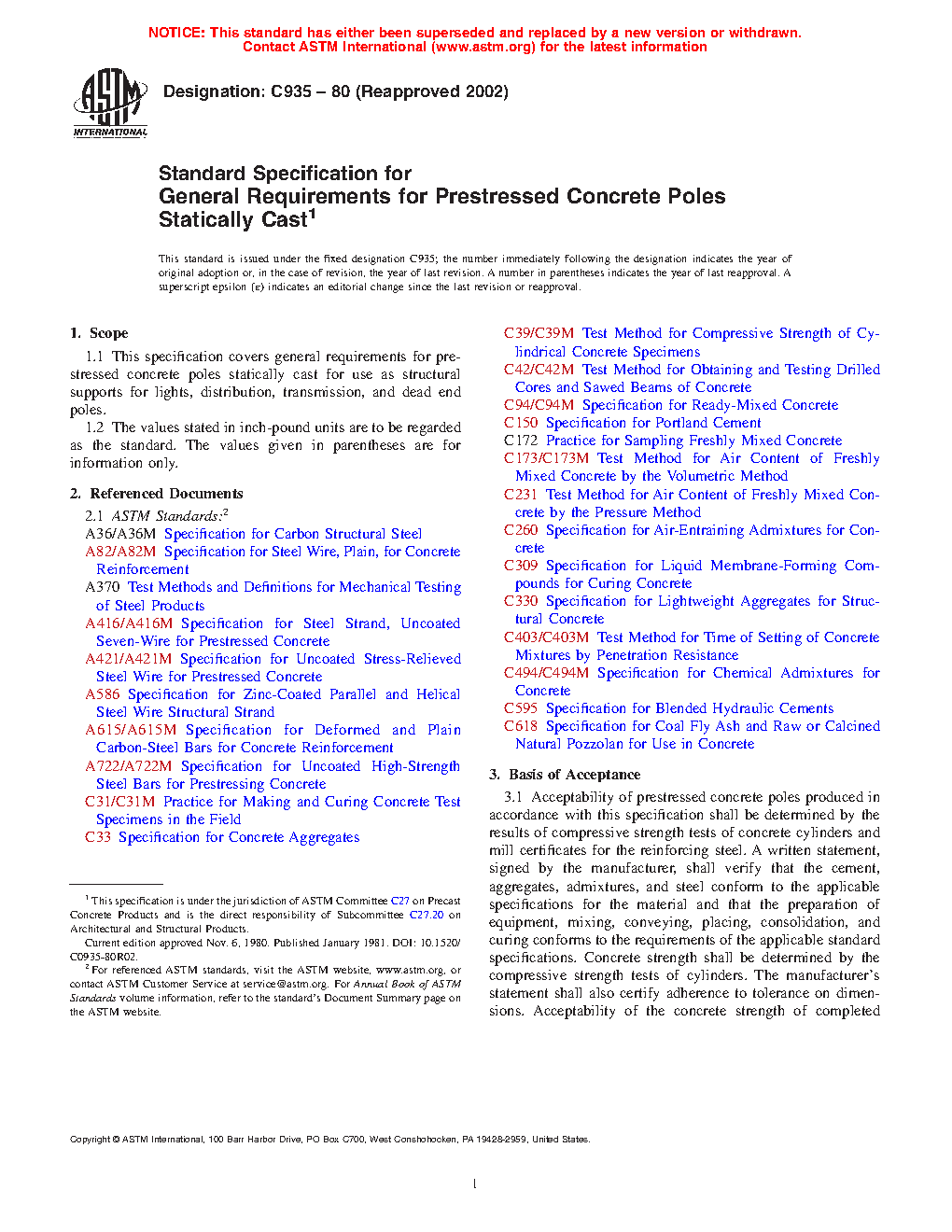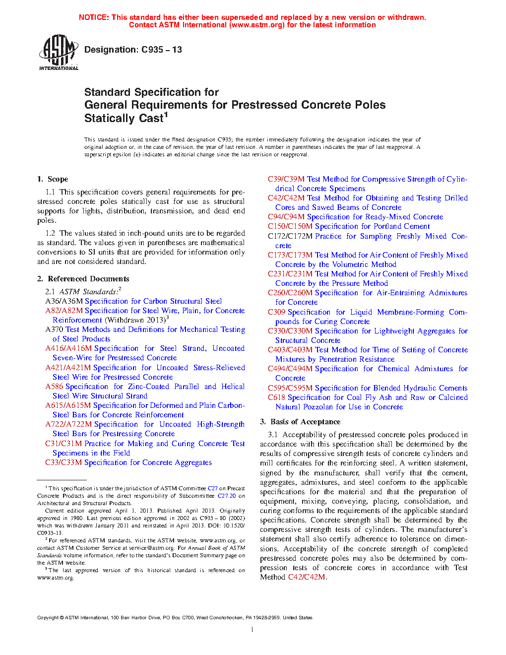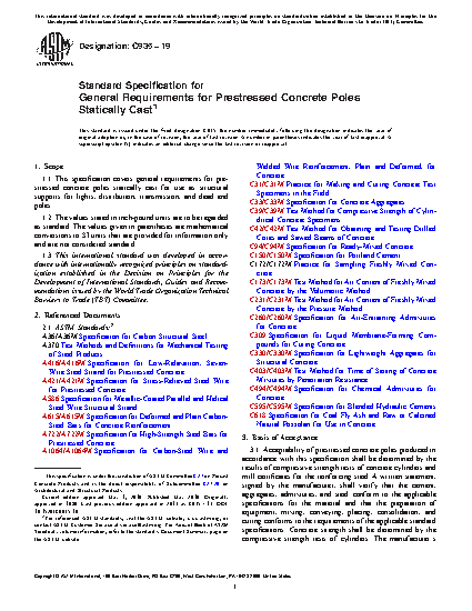 1.1 This specification covers general requirements for prestressed concrete poles statically cast for use as structural supports for lights, distribution, transmission, and dead end poles.