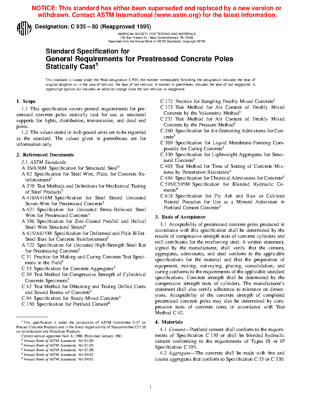 This specification covers the general requirements for statically cast prestressed concrete poles intended for use as structural supports for lights, distribution, transmission and dead end poles. The products made up of cements, aggregates, admixtures, and steels that meet the requirements. Products may be manufactured by accelerated curing, water curing, membrane curing or steam curing, then prestressed and reinforced. Water used for curing, washing aggregates, and mixing concrete should be free from substances in amounts that may be harmful to concrete or steel. Poles should be designed to carry all the forces associated with prestressing, handling, storage, installation, loading, and other service conditions.