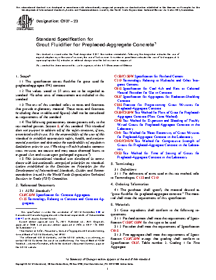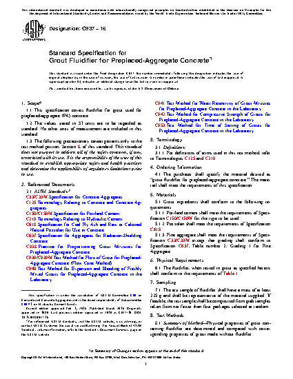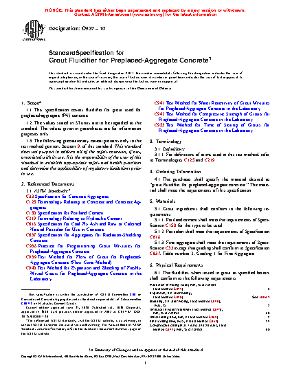 This specification covers fluidifier for grout used for preplaced-aggregate (PA) concrete. Grout ingredients shall conform to the specified requirements for Portland cement, pozzolan, and fine aggregate composition. The fluidifier, tested in grout shall conform to the specified values of reduction in mixing water, expansion, bleeding, increase in water retentivity, initial and final setting time, and compressive strength.