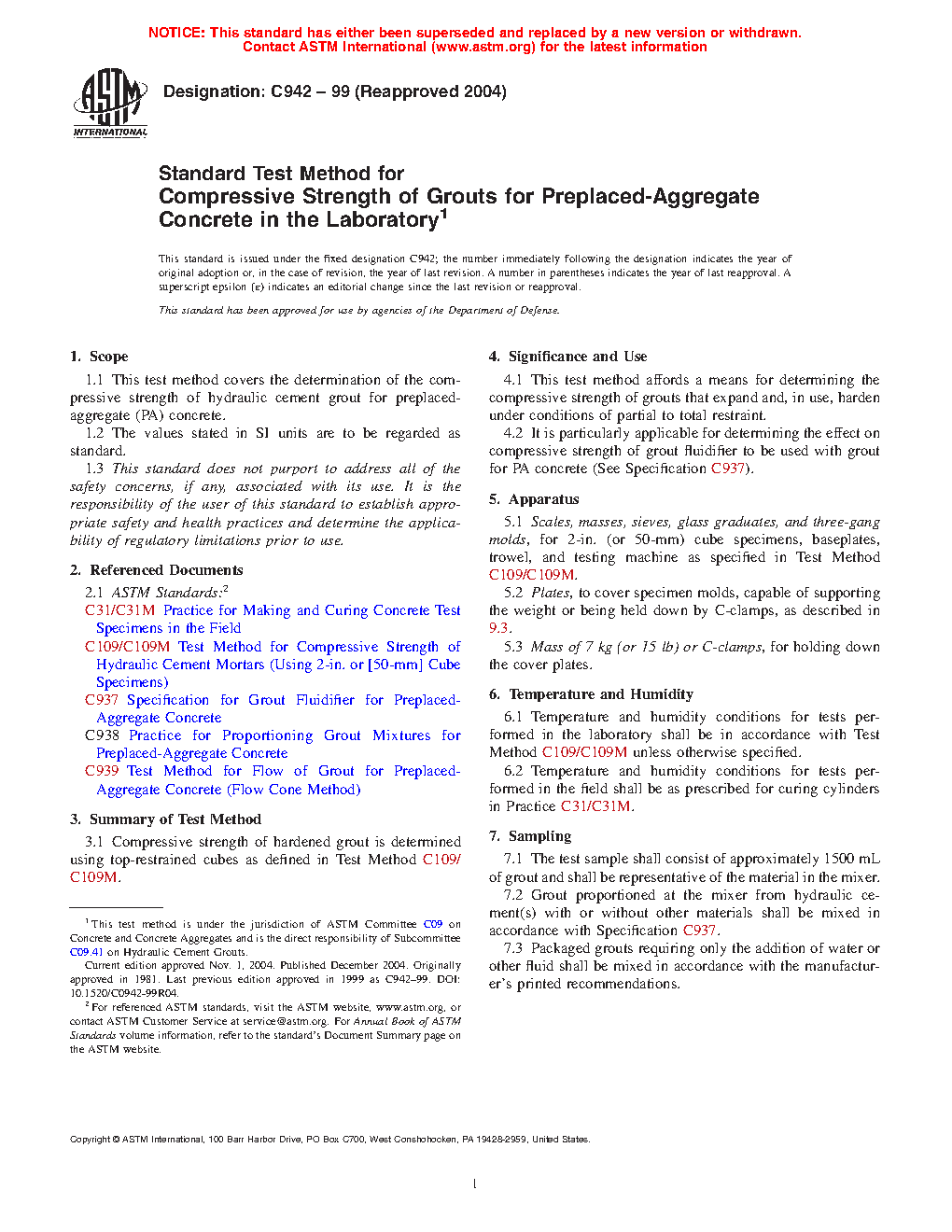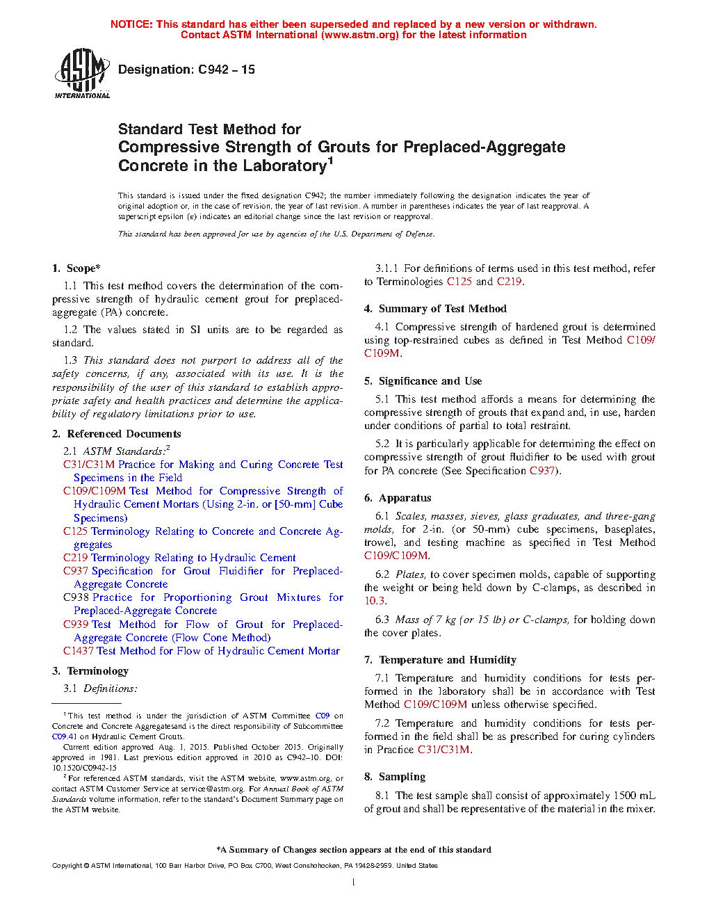 Standard Test Method for Compressive Strength of Grouts for Preplaced-Aggregate Concrete in the Laboratory
