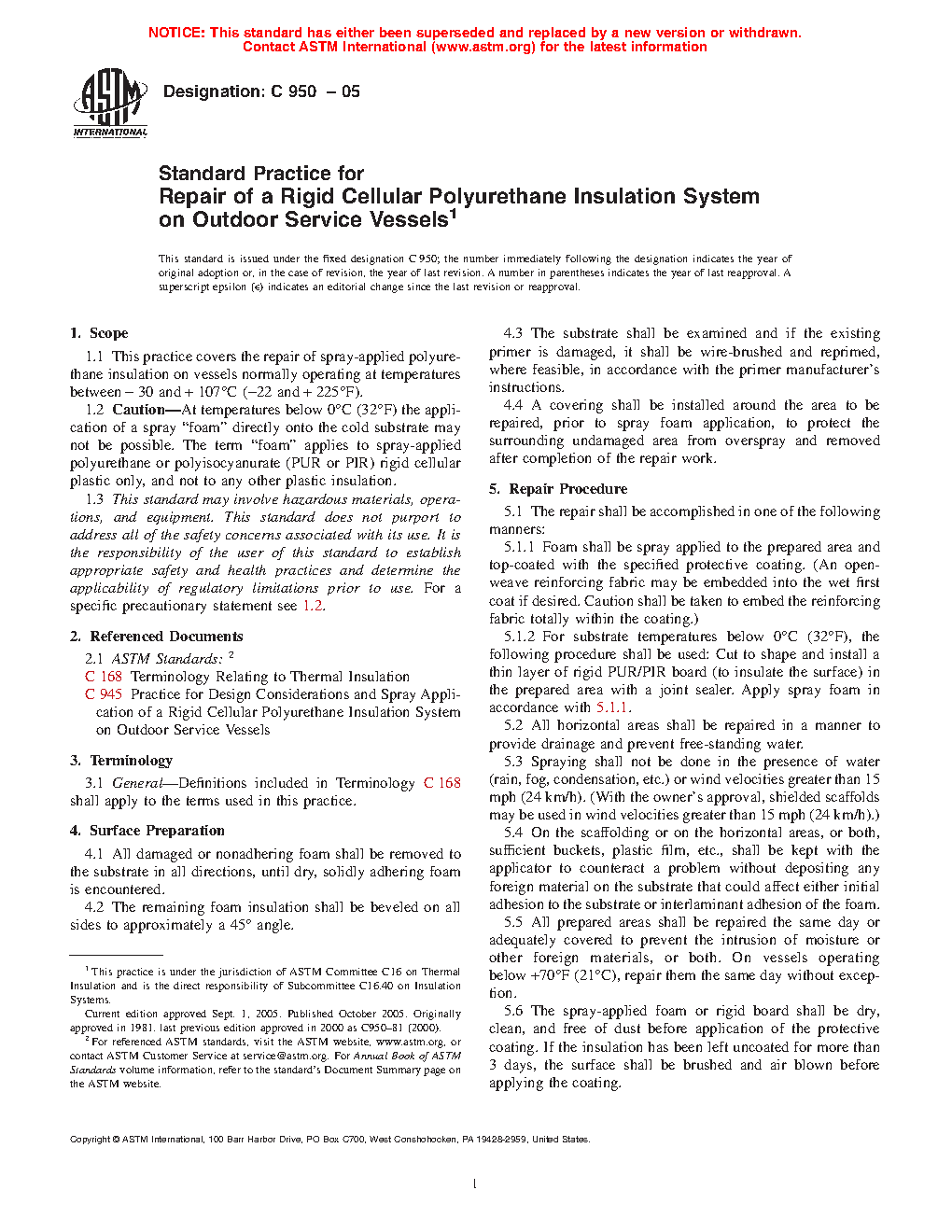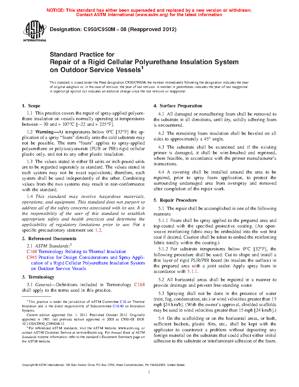 1.1 This practice covers the repair of spray-applied polyurethane insulation on vessels normally operating at temperatures between − 30 and + 107°C [−22 and + 225°F].