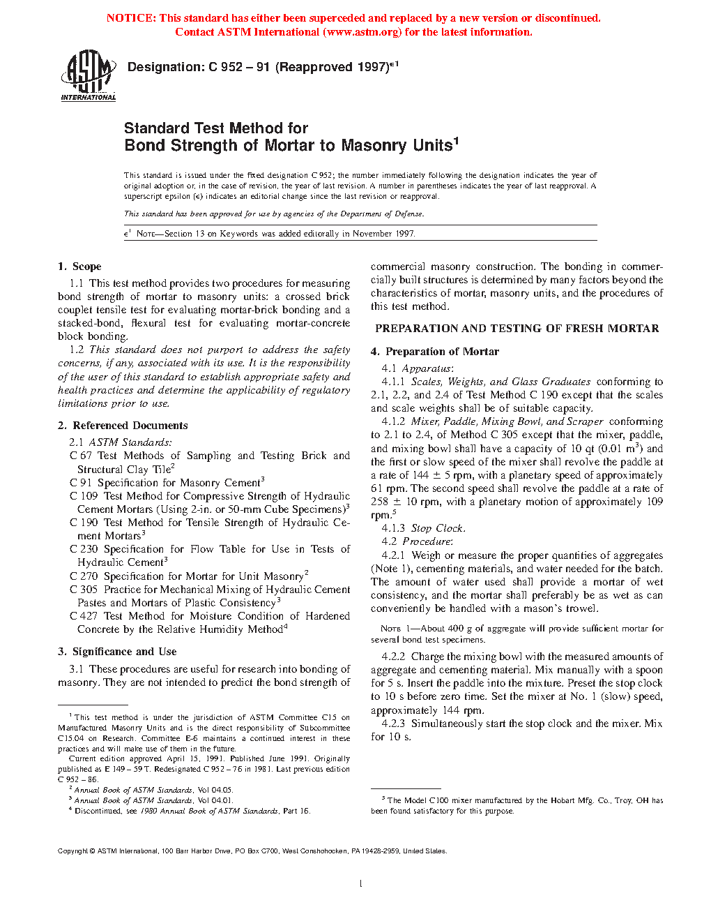3.1 These procedures are useful for research into bond strength of masonry. They are not intended to predict the bond strength of commercial masonry construction. The bond strength in commercially built structures is determined by many factors beyond the characteristics of mortar, masonry units, and the procedures of this test method.