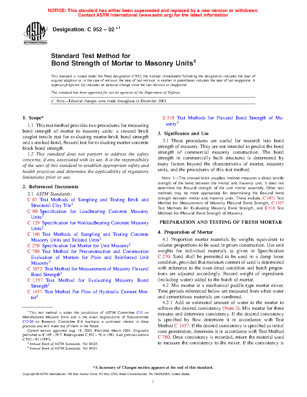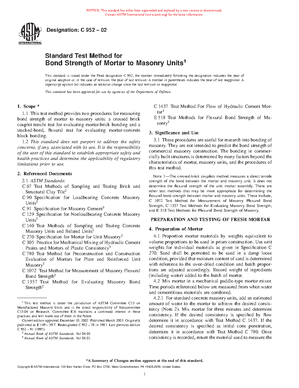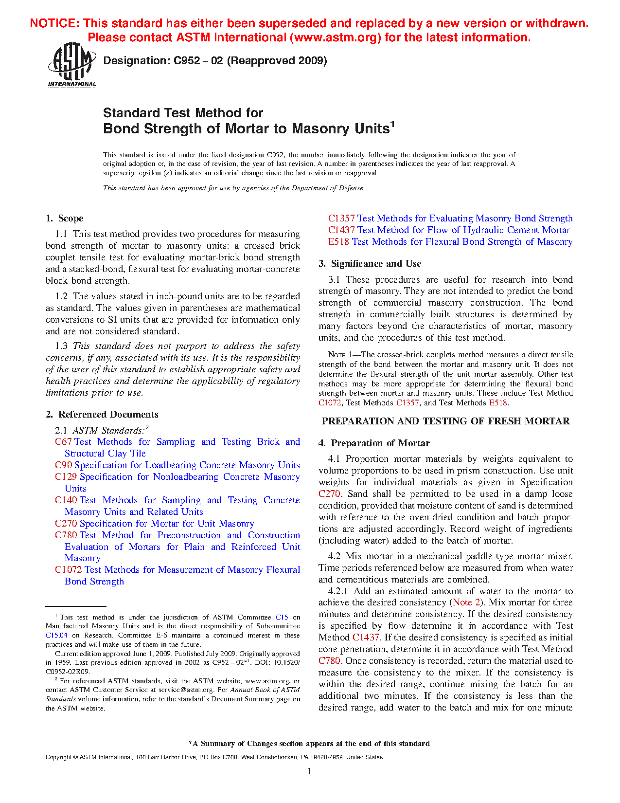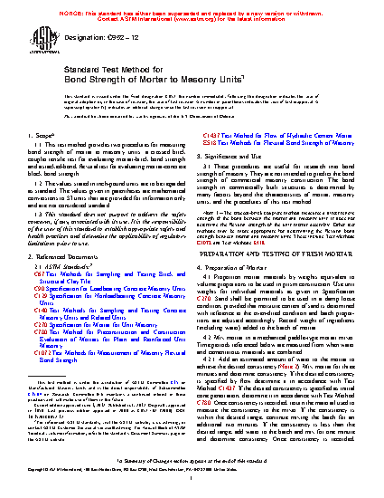1.1 This test method provides two procedures for measuring bond strength of mortar to masonry units: a crossed brick couplet tensile test for evaluating mortar-brick bond strength and a stacked-bond, flexural test for evaluating mortar-concrete block bond strength.