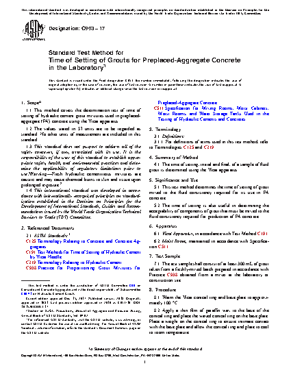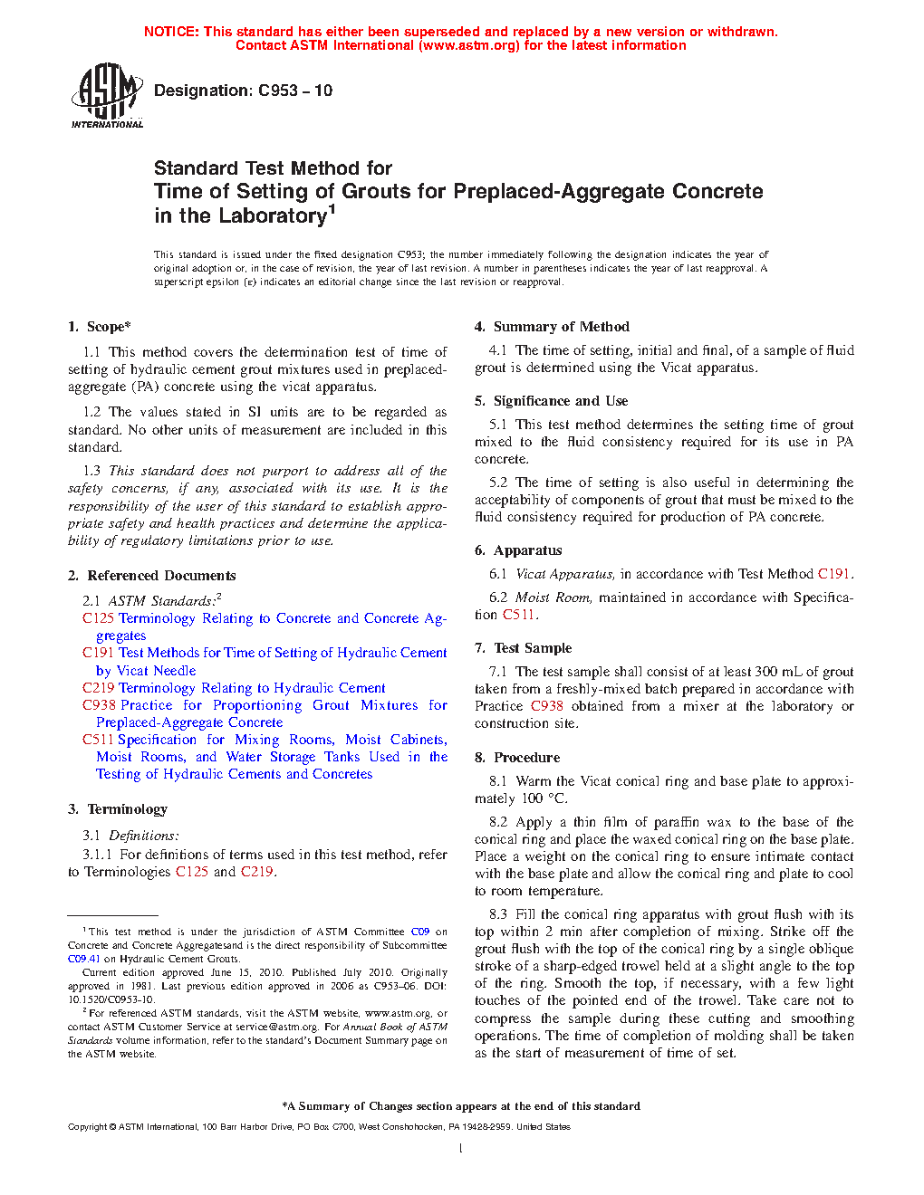 This test method determines the setting time of grout mixed to the fluid consistency required for its use in PA concrete.