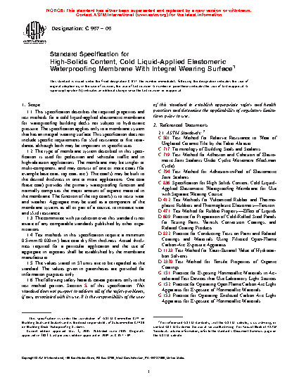 1.1 This specification describes the required properties and test methods for a cold liquid-applied elastomeric membrane for waterproofing building decks not subject to hydrostatic pressure. The specification applies only to a membrane system that has an integral wearing surface. This specification does not include specific requirements for skid resistance or fire retardance, although both may be important in specific uses.