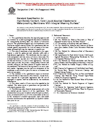 1.2 The type of membrane system described in this specification is used for pedestrian and vehicular traffic and in high-abrasion applications. The membrane may be single- or multi-component, and may consist of one or more coats (for example base coat, top coat, etc.). The coat(s) may be built to the desired thickness in one or more applications. One coat (base coat) provides the primary waterproofing function and normally comprises the major amount of organic material in the membrane. The function of the top coat(s) is to resist wear and weather. Aggregate may be used as a component of the membrane system, as all or part of a course, to increase wear and skid resistance.