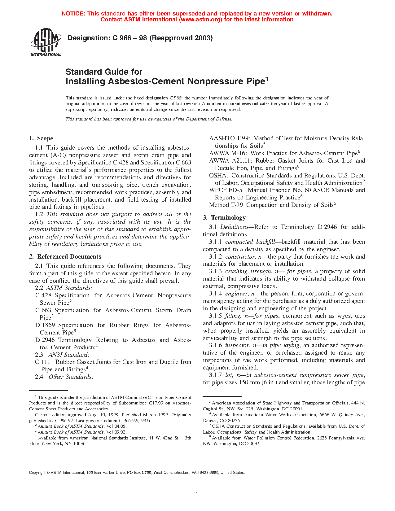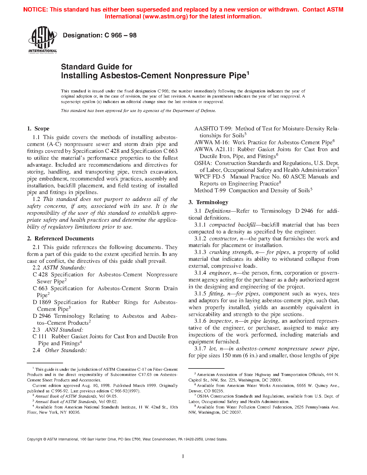 1.3 Warning—Breathing of asbestos dust is hazardous. Asbestos and asbestos products present demonstrated health risks for users and for those with whom they come into contact. In addition to other precautions, when working with asbestos-cement products, minimize the dust that results. For information on the safe use of chrysotile asbestos, refer to “Safe Use of Chrysotile: A Manual on Preventive and Control Measures.”2