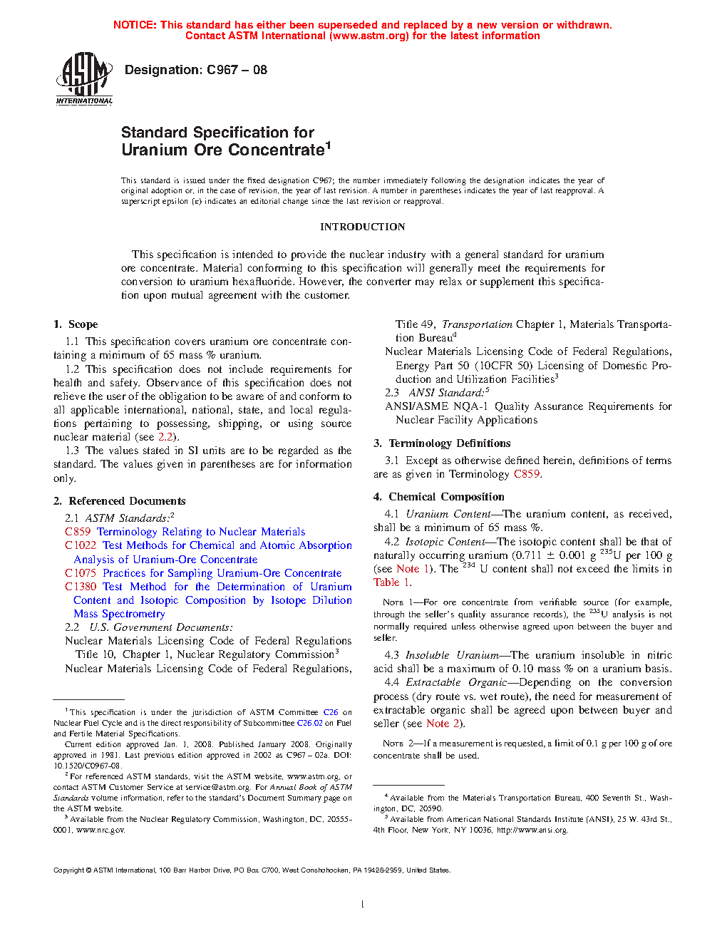 1.1 This specification covers uranium ore concentrate containing a minimum of 65 mass % uranium.