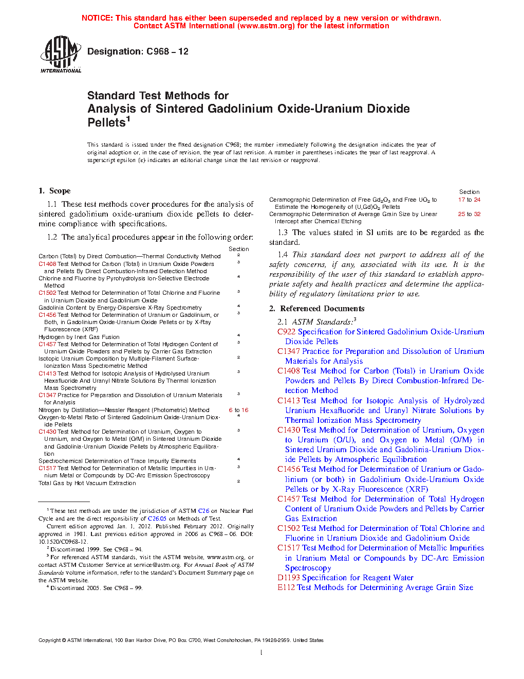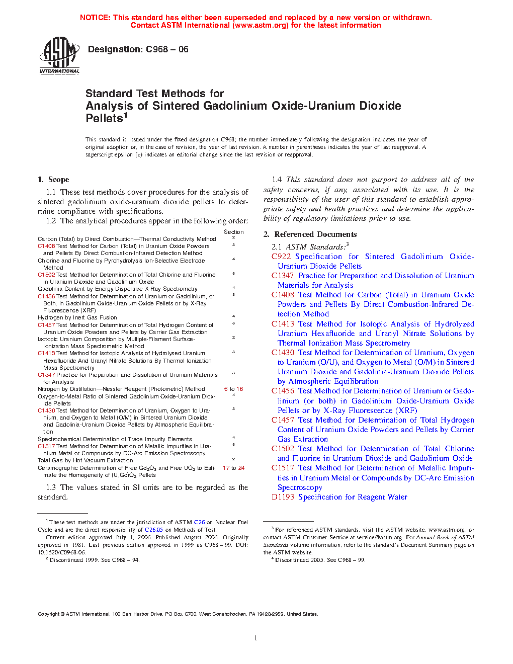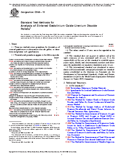 | C1456 Test Method for Determination of Uranium or Gadolinium (or both) in Gadolinium Oxide-Uranium Oxide Pellets or by X-Ray Fluorescence (XRF) | 3 |
