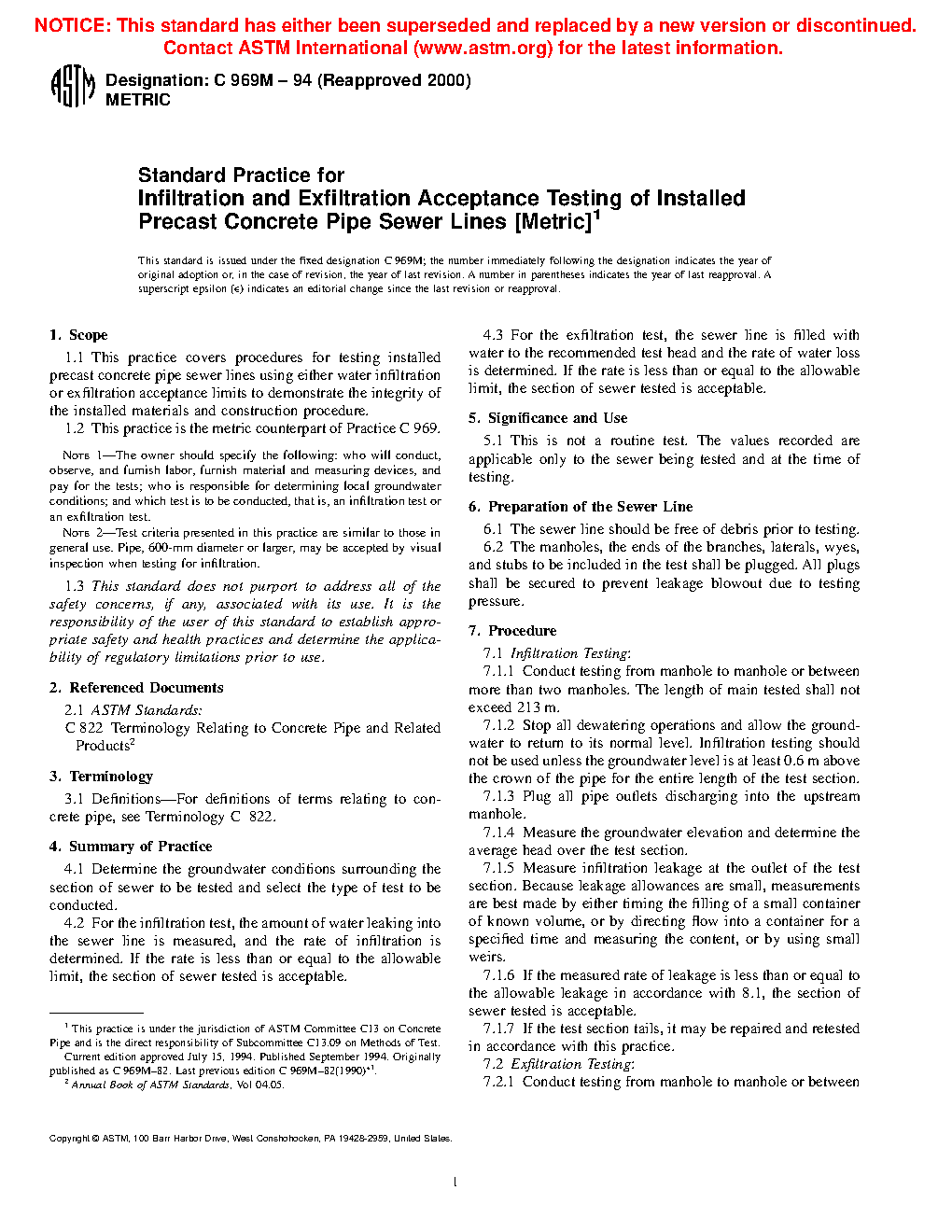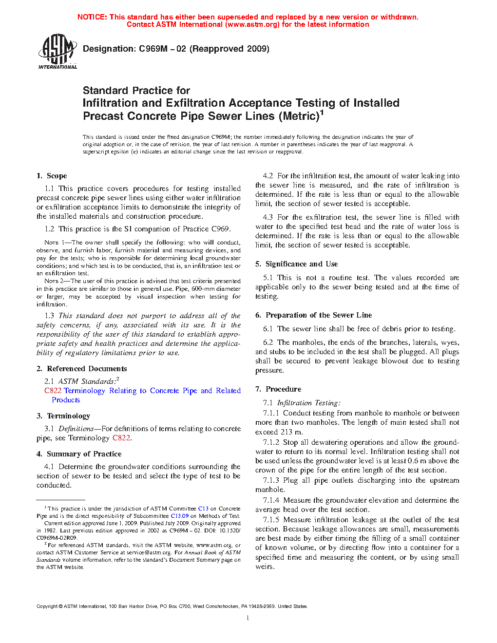 1.1 This practice covers procedures for testing installed precast concrete pipe sewer lines using either water infiltration or exfiltration acceptance limits to demonstrate the integrity of the installed materials and construction procedure.