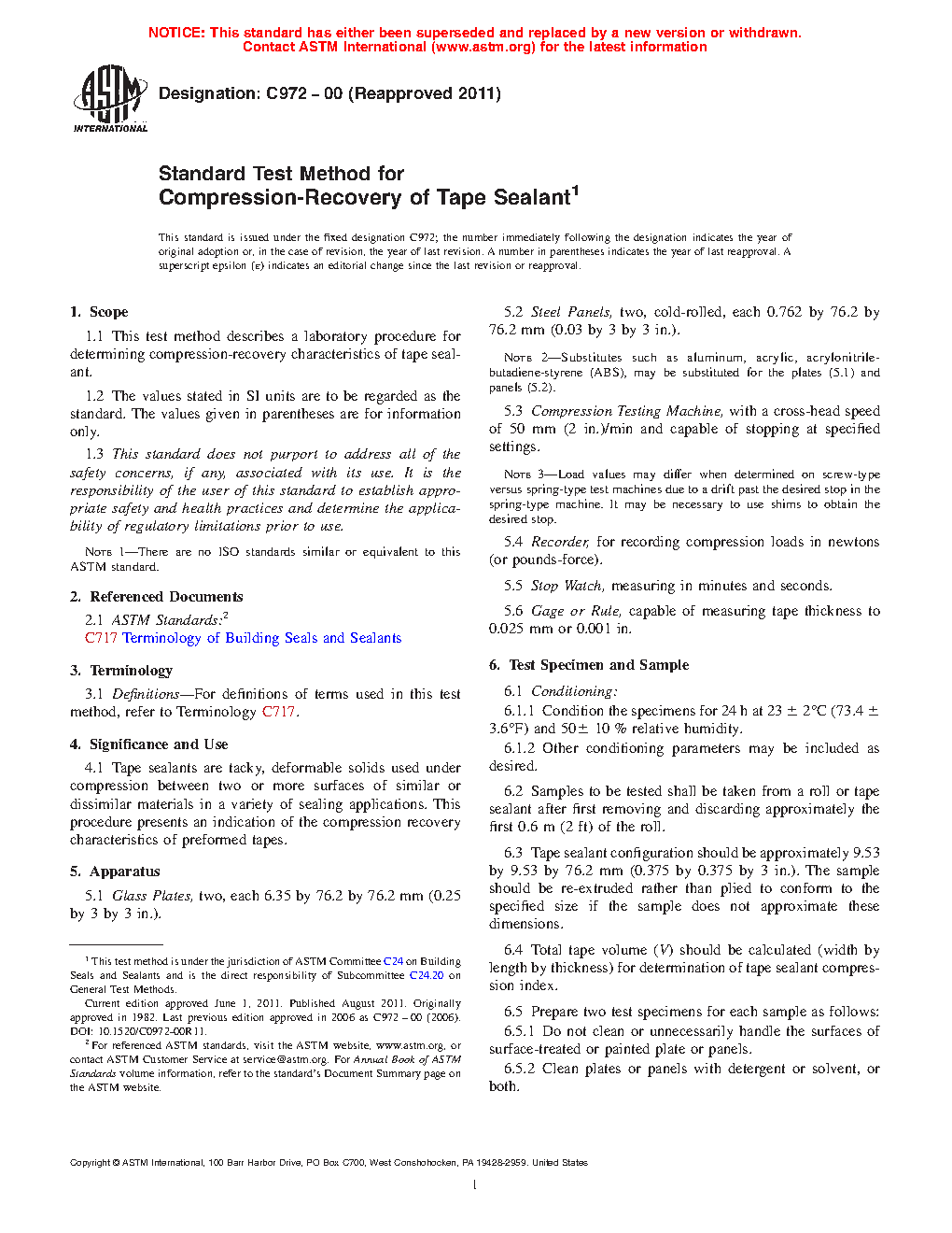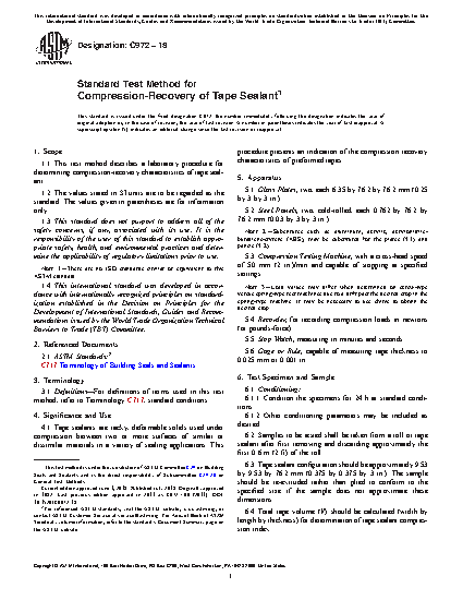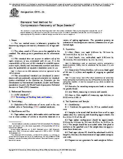 4.1 Tape sealants are tacky, deformable solids used under compression between two or more surfaces of similar or dissimilar materials in a variety of sealing applications. This procedure presents an indication of the compression recovery characteristics of preformed tapes.