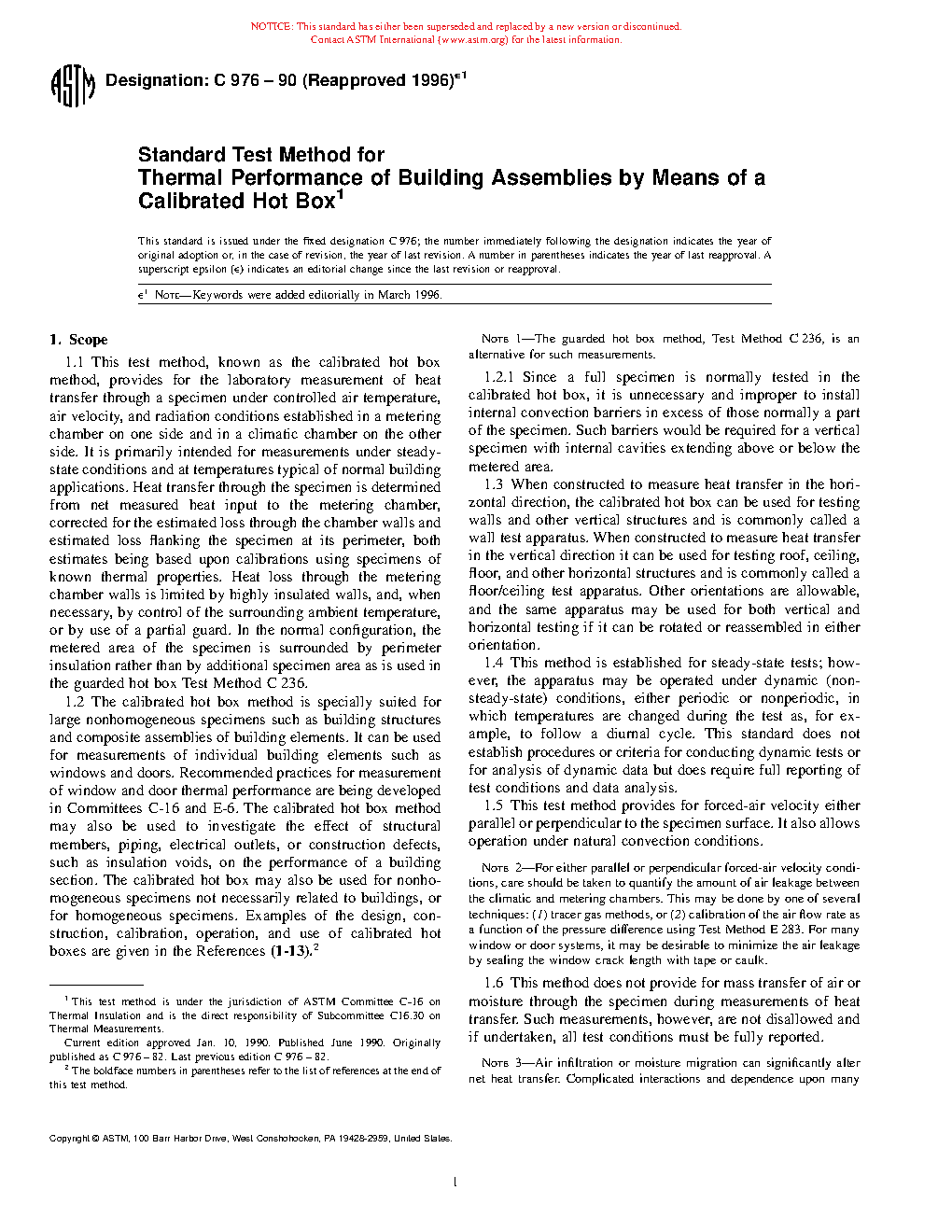 Note 1-The guarded hot box method, Test Method C236, is an alternative for such measurements.1.2.1 Since a full specimen is normally tested in the calibrated hot box, it is unnecessary and improper to install internal convection barriers in excess of those normally a part of the specimen. Such barriers would be required for a vertical specimen with internal cavities extending above or below the metered area.