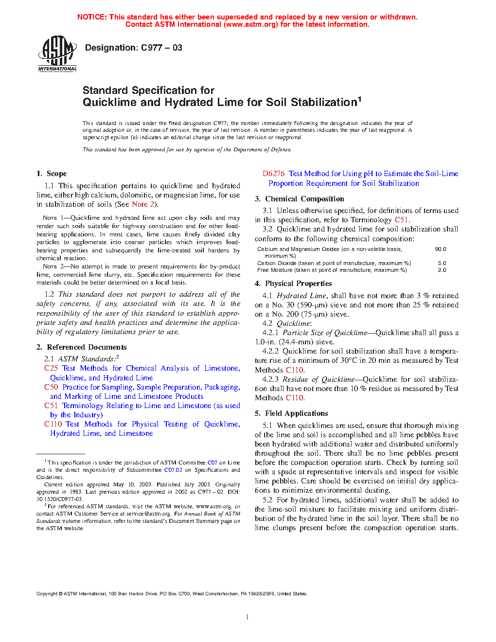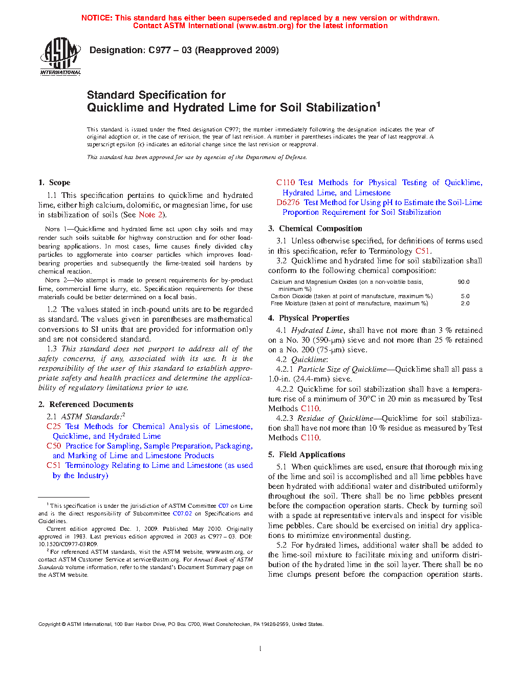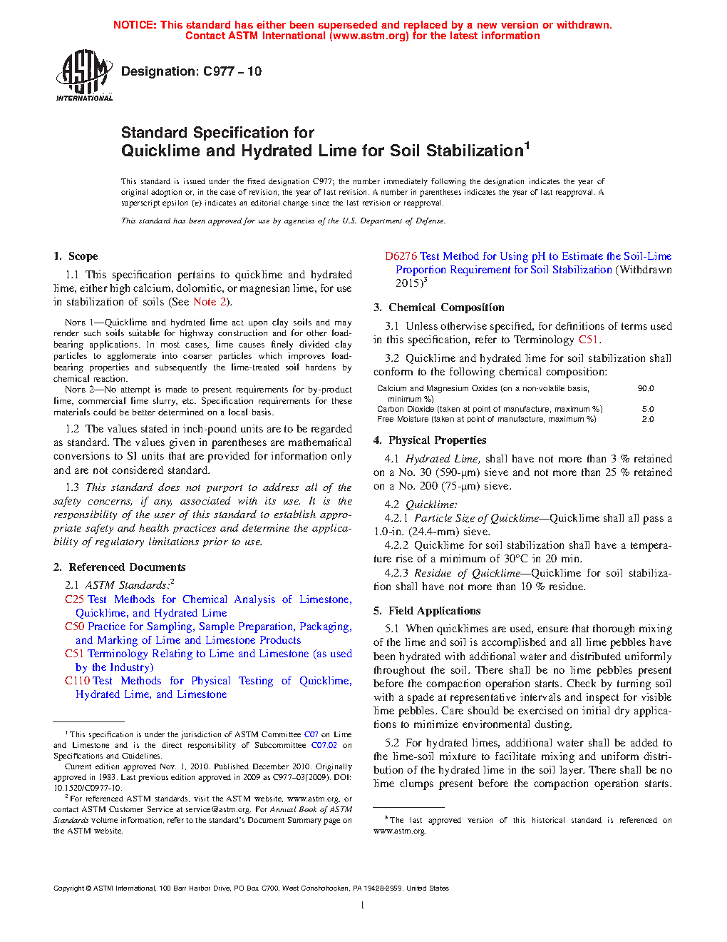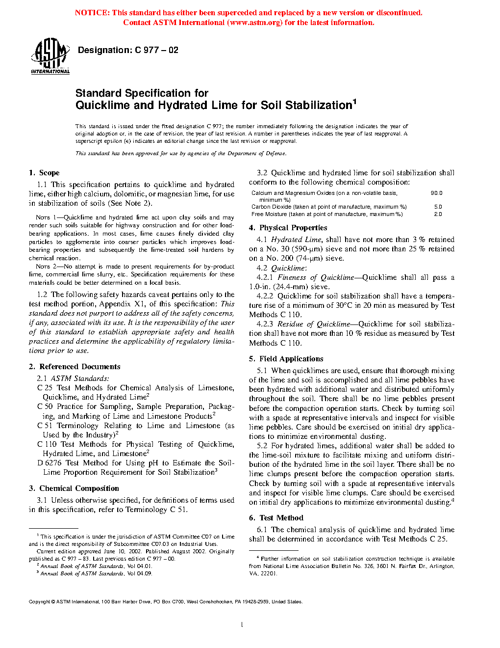 This specification pertains to quicklime and hydrated lime, either high calcium, dolomitic, or magnesium lime, for use in stabilization of soils. Quicklime and hydrated lime for soil stabilization shall conform to the required chemical composition for calcium, magnesium oxides, carbon dioxide, and free moisture. The physical properties of hydrated lime, quicklime, and residue of quicklime shall not exceed the specified limits. Chemical analysis of quicklime and hydrated lime shall be conducted. The particle size of hydrated lime shall be determined in accordance with the sieve analysis of hydrated lime in the referenced standard test method.