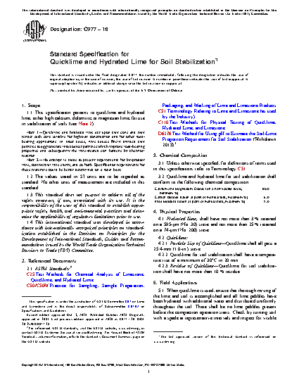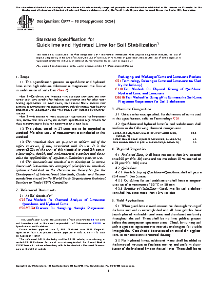 1.1 This specification pertains to quicklime and hydrated lime, either high calcium, dolomitic, or magnesian lime, for use in stabilization of soils (see Note 2).