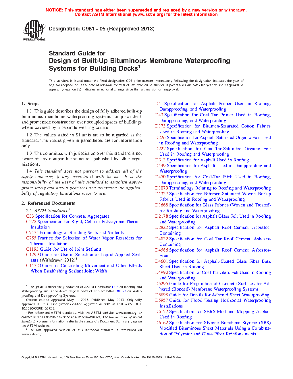 1.1 This guide describes the design of fully adhered built-up bituminous membrane waterproofing systems for plaza deck and promenade construction over occupied spaces of buildings where covered by a separate wearing course.