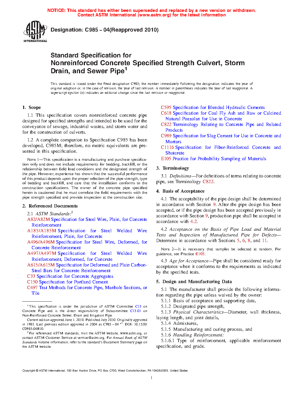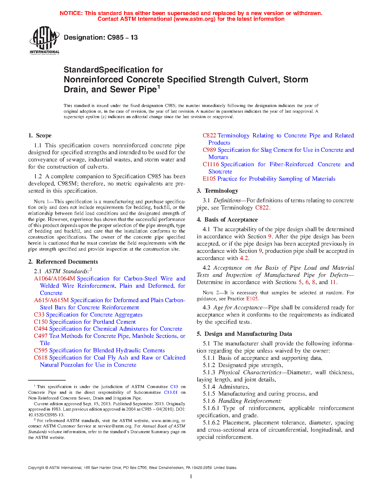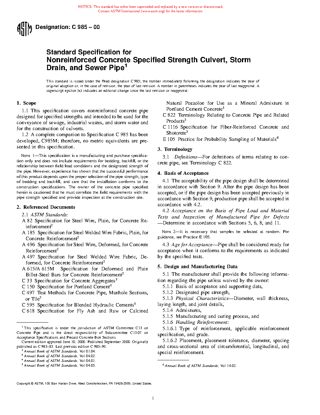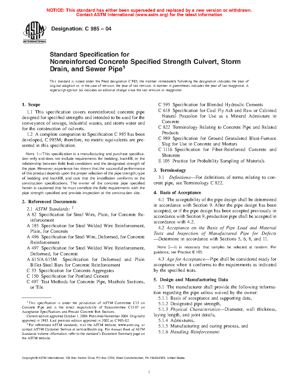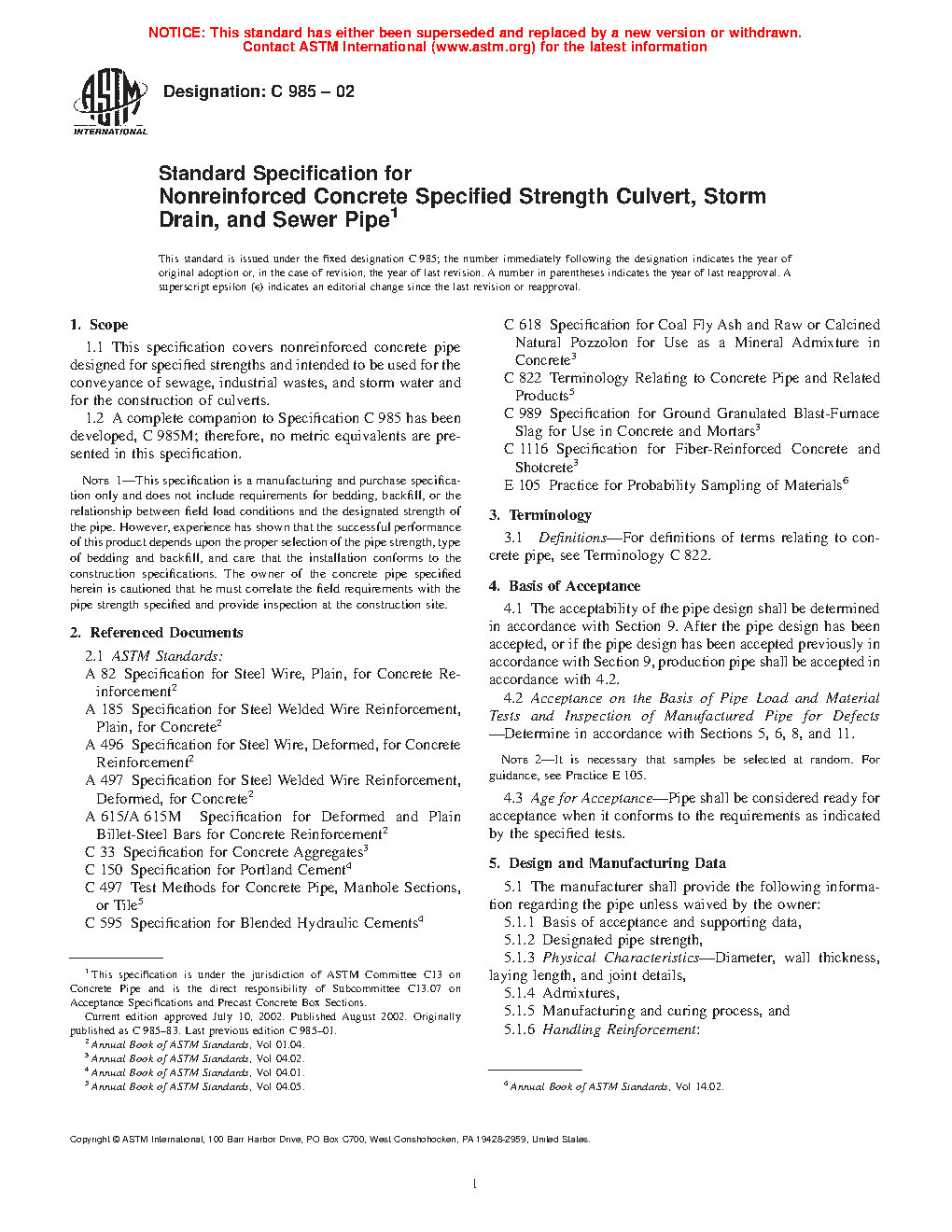 Note 1-This specification is a manufacturing and purchase specification only and does not include requirements for bedding, backfill, or the relationship between field load conditions and the designated strength of the pipe. However, experience has shown that the successful performance of this product depends upon the proper selection of the pipe strength, type of bedding and backfill, and care that the installation conforms to the construction specifications. The owner of the concrete pipe specified herein is cautioned that he must correlate the field requirements with the pipe strength specified and provide inspection at the construction site.