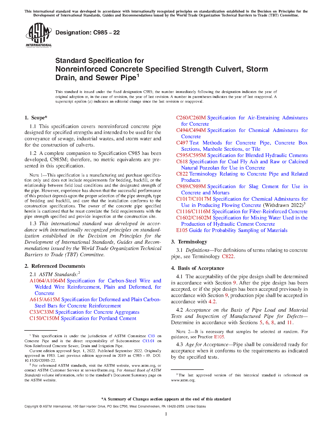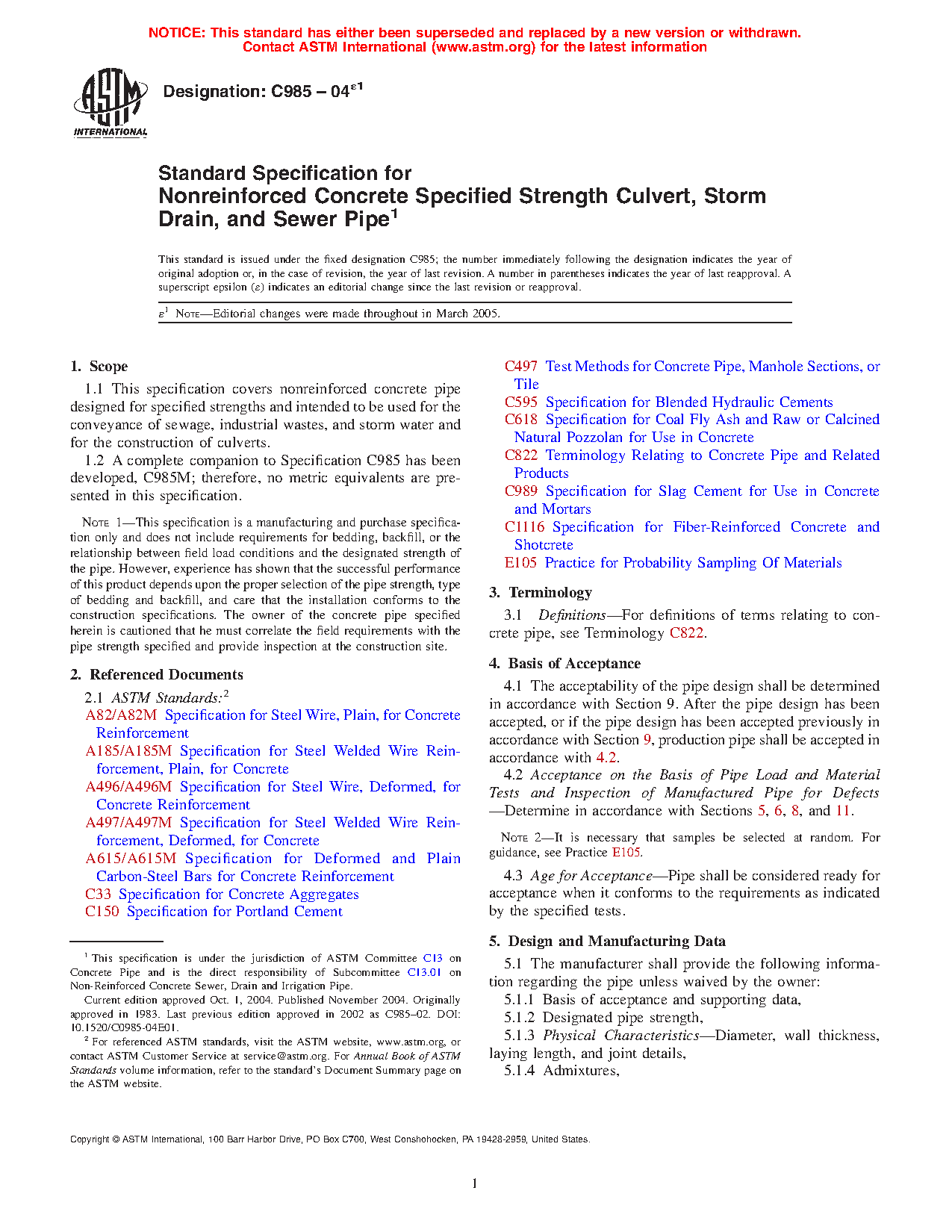1.1 This specification covers nonreinforced concrete pipe designed for specified strengths and intended to be used for the conveyance of sewage, industrial wastes, and storm water and for the construction of culverts.