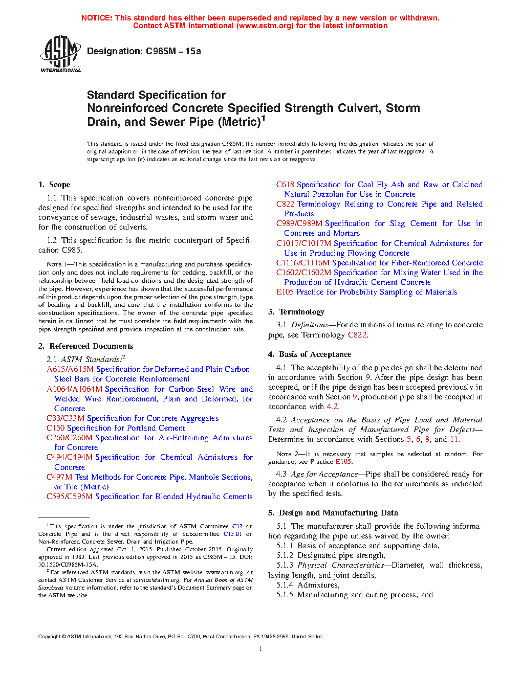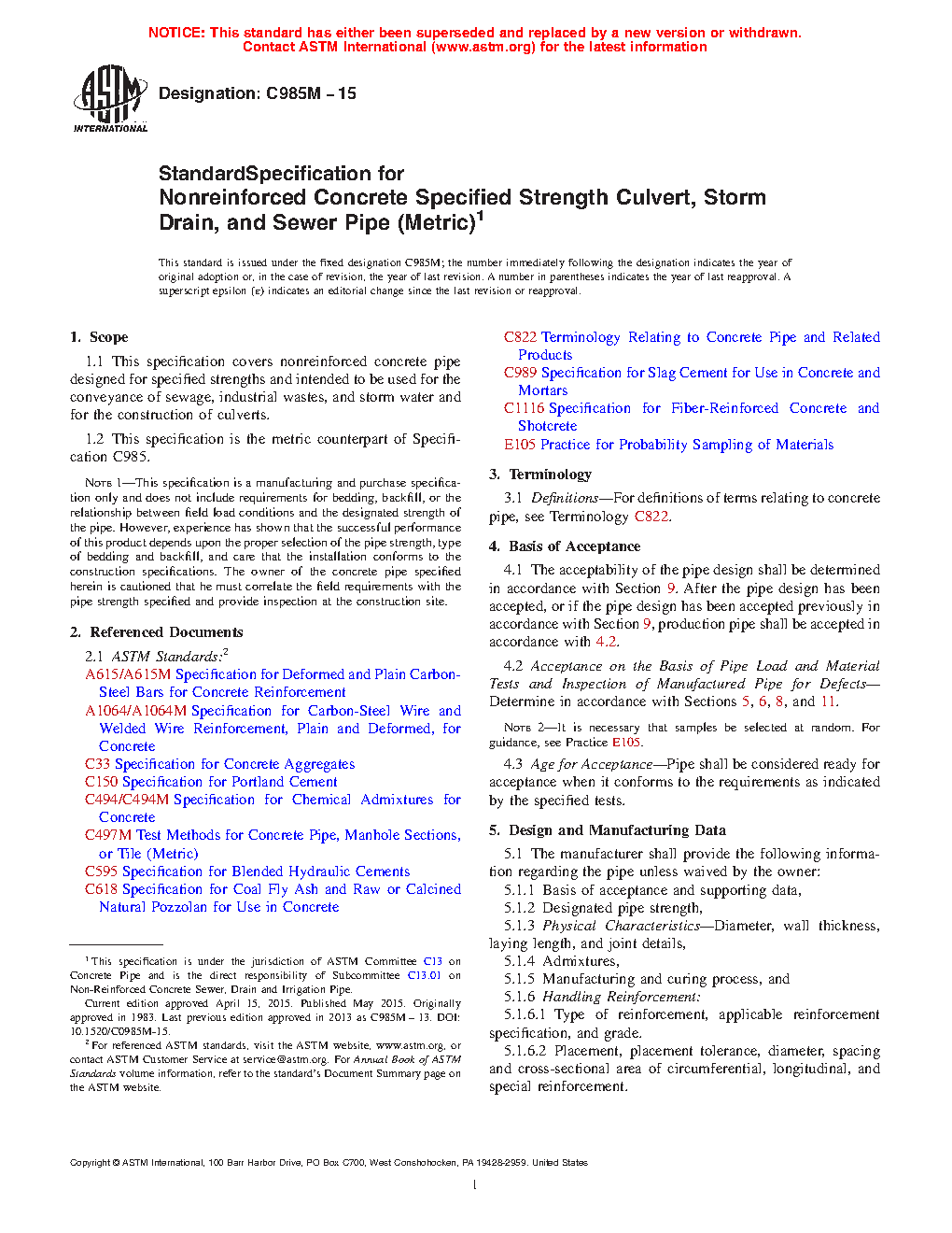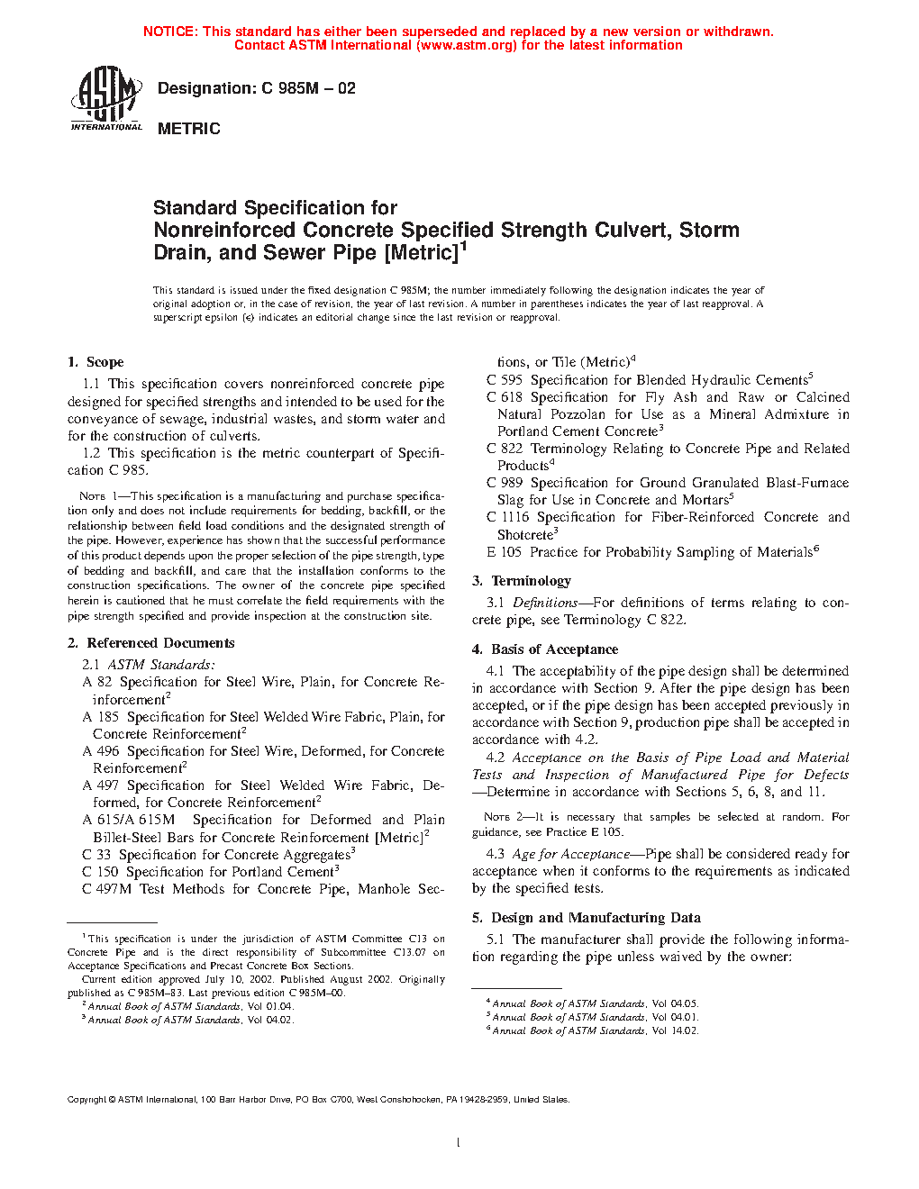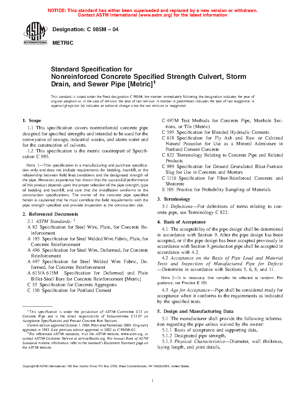 Note 1: This specification is a manufacturing and purchase specification only and does not include requirements for bedding, backfill, or the relationship between field load conditions and the designated strength of the pipe. However, experience has shown that the successful performance of this product depends upon the proper selection of the pipe strength, type of bedding and backfill, and care that the installation conforms to the construction specifications. The owner of the concrete pipe specified herein is cautioned that he must correlate the field requirements with the pipe strength specified and provide inspection at the construction site.