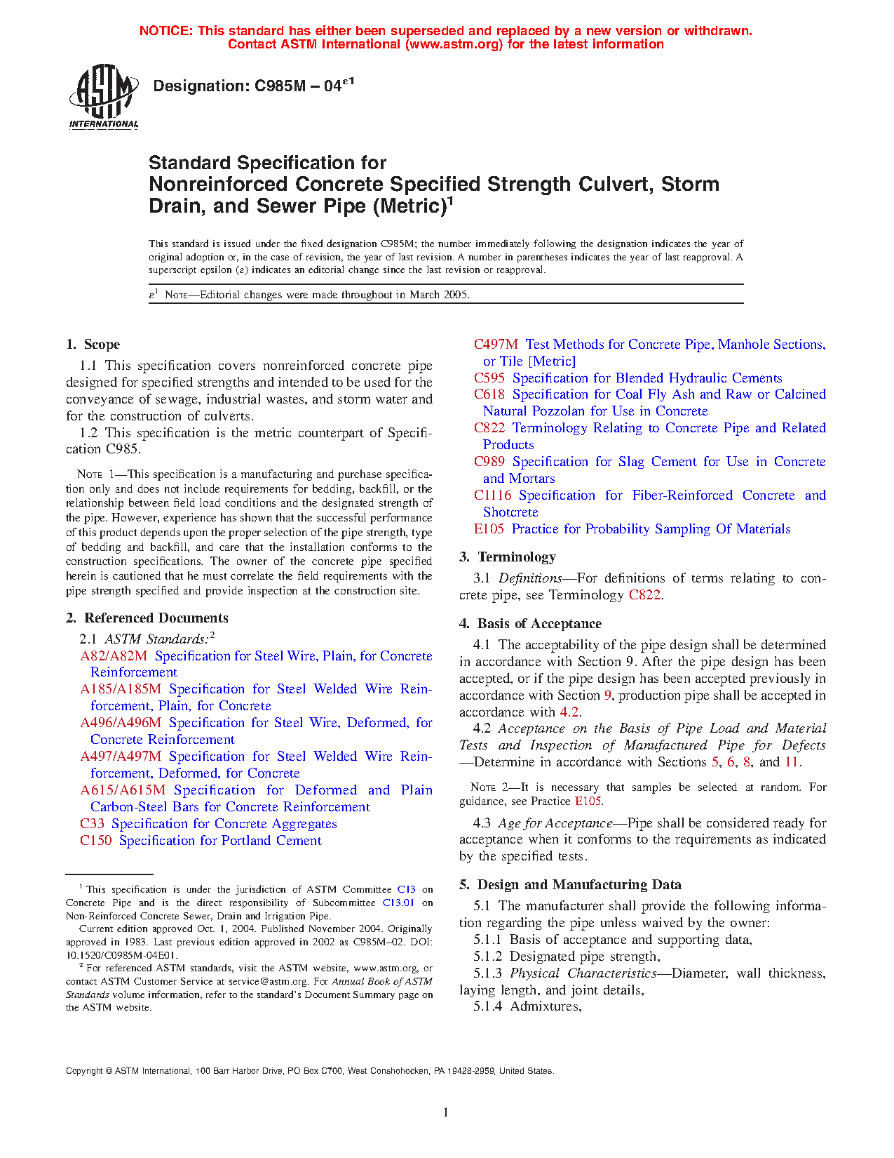 This specification covers nonreinforced concrete pipe designed for specified strengths and intended to be used for the conveyance of sewage, industrial wastes, and storm water and for the construction of culverts. Strength test and load test shall be made in accordance with the specified requirements.