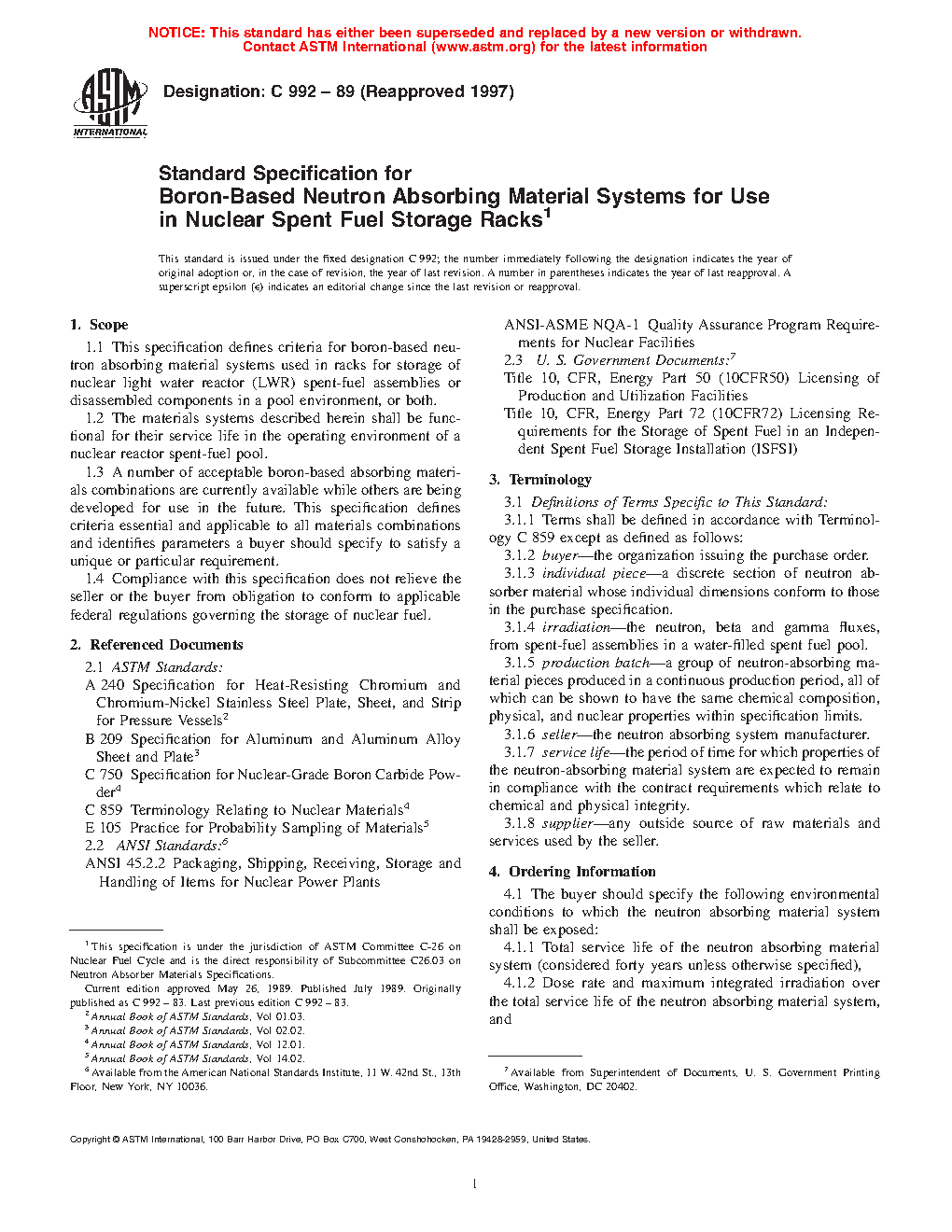 1.1 This specification defines criteria for boron-based neutron absorbing material systems used in racks in a pool environment for storage of nuclear light water reactor (LWR) spent-fuel assemblies or disassembled components to maintain sub-criticality in the storage rack system.
