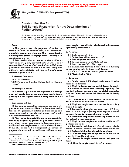 1.1 This practice covers the preparation of surface soil samples collected for analysis of radionuclide constituents, particularly uranium and plutonium. This practice describes one acceptable approach to the preparation of soil samples for radiochemical analysis.