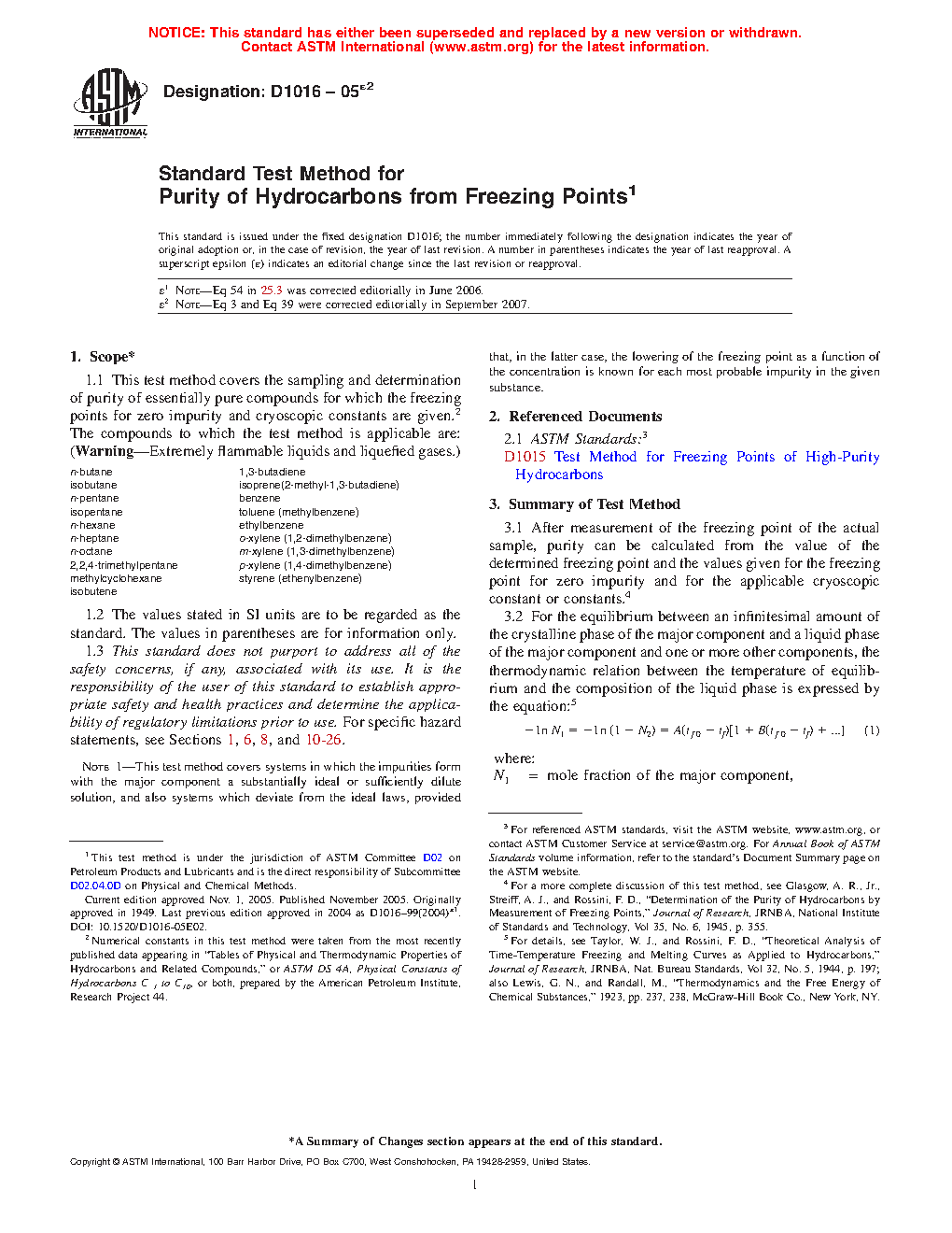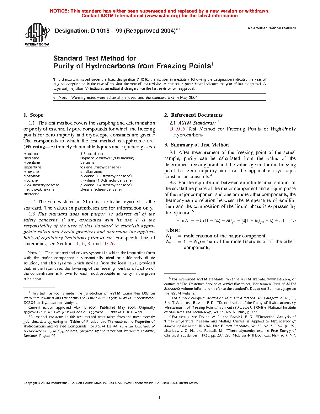 1.1 This test method covers the sampling and determination of purity of essentially pure compounds for which the freezing points for zero impurity and cryoscopic constants are given.2 The compounds to which the test method is applicable are: (Warning—Extremely flammable liquids and liquefied gases.)