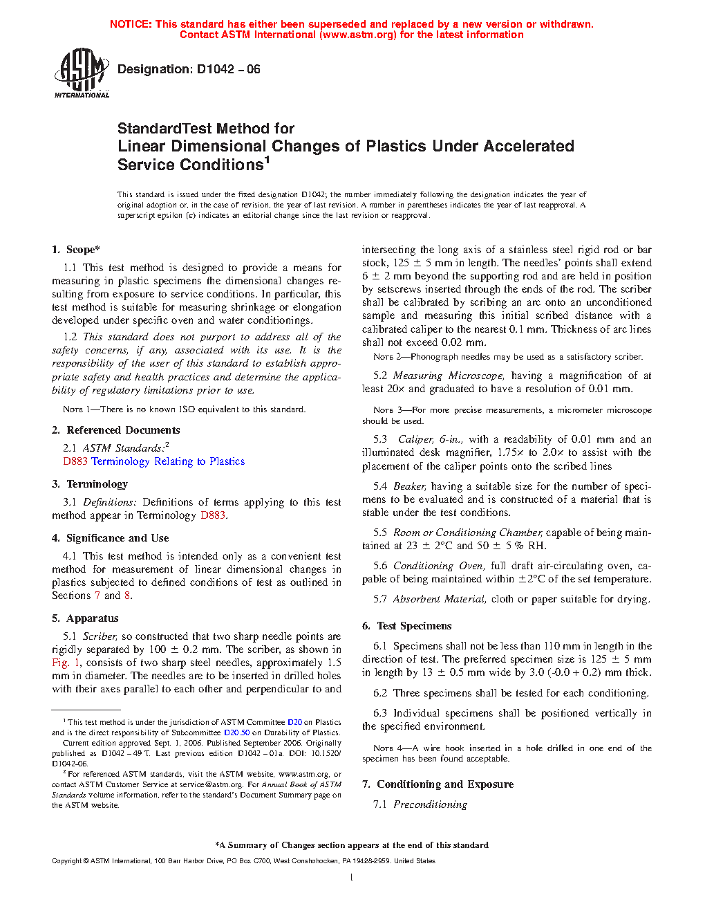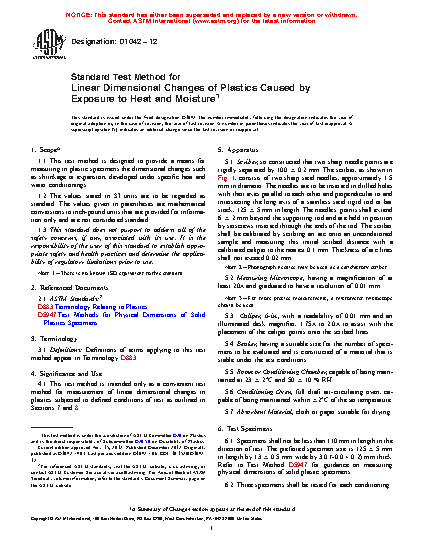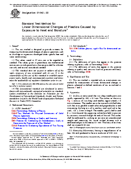 1.1 This test method is designed to provide a means for measuring in plastic specimens the dimensional changes such as shrinkage or expansion, developed under specific heat and water conditionings.