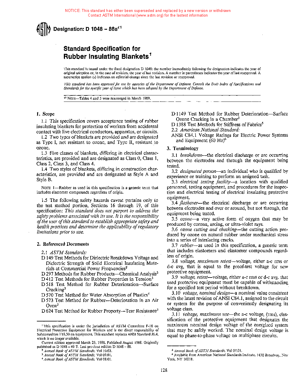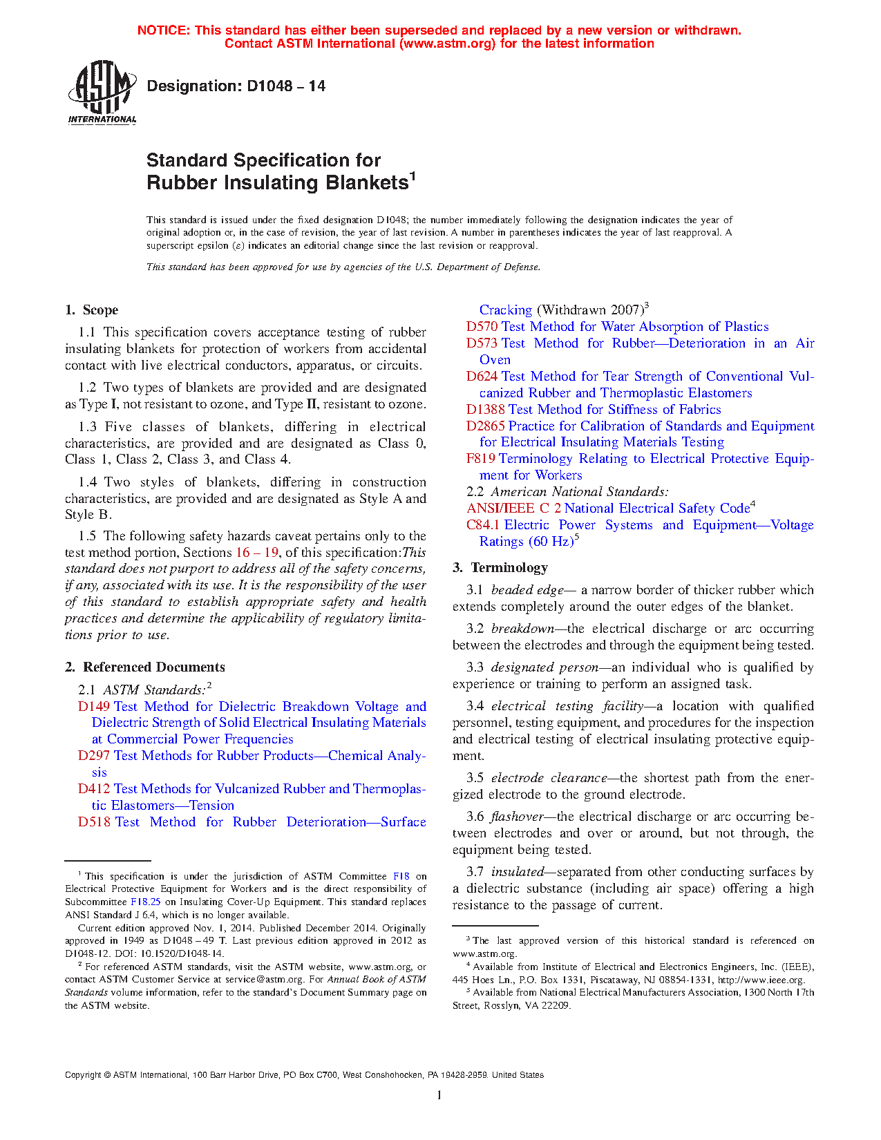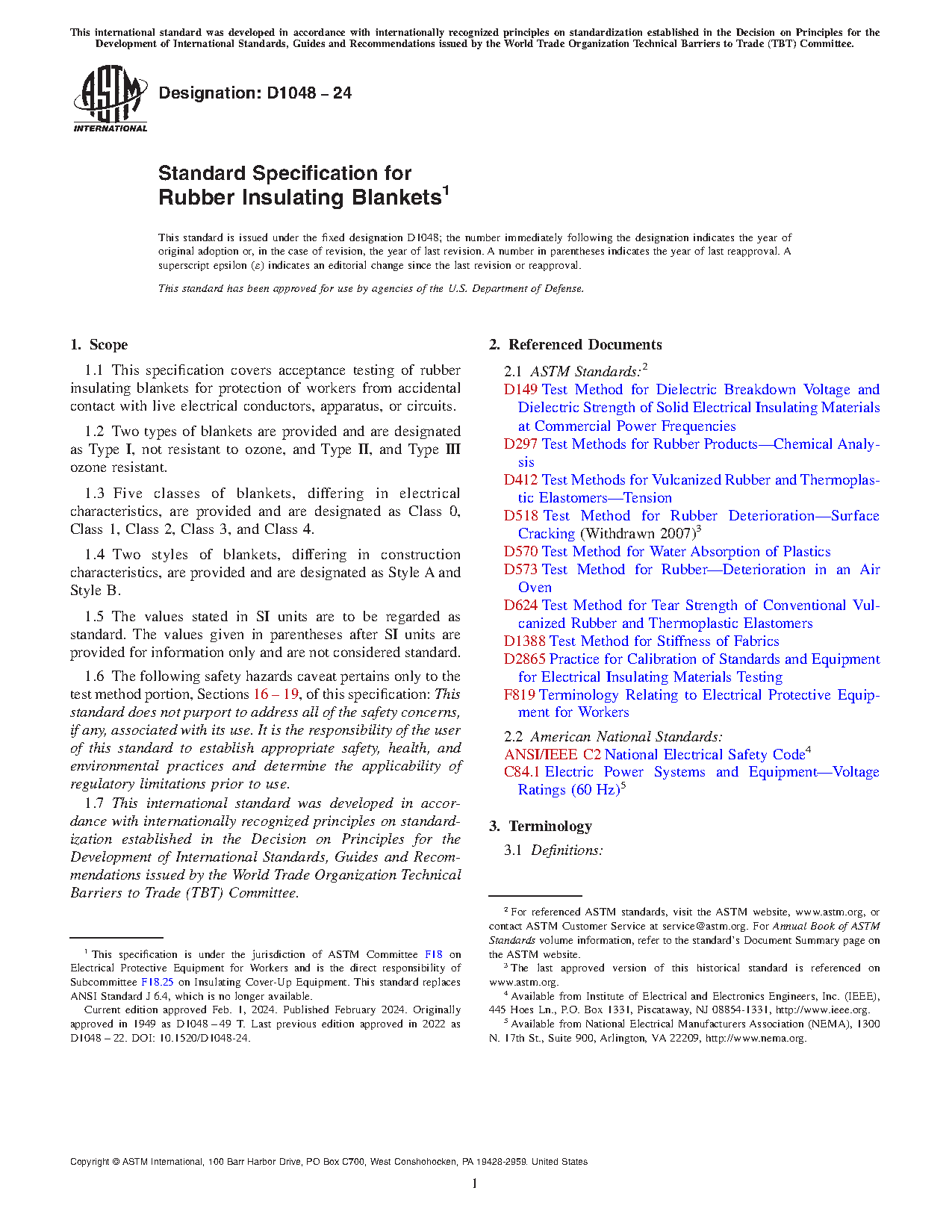 This specification covers the acceptance testing of insulating rubber blankets that are used for the personal protection of workers from accidental contact with live electrical conductors, apparatus, or circuits. Two types of blankets, differing in chemical and physical characteristics, are provided and are designated as: Type I, made from properly vulcanized high-grade cis-1,4-polyisoprene rubber compound of natural or synthetic origin that is non-resistant to ozone; and Type II, made of any elastomer or combination of elastomeric compounds that is resistant to ozone. Five classes of blankets, designated as Classes 0, 1, 2, 3, and 4, are assigned according to electrical protection characteristics. Styles of blankets are designated in accordance to construction characteristics, namely: Style A, blankets free of any reinforcements; and Style B, blankets incorporated with reinforcement(s). When evaluated in accordance with the test procedures detailed herein, the blankets shall adhere to the following property requirements: electrical properties such as phase-phase maximum use voltage, AC and DC proof-test voltages, AC and DC dielectric breakdown test voltages, and AC and DC clearances; and physical and chemical properties such as ozone resistance, moisture absorption, tensile strength, tension set, elongation, drape stiffness, flex stiffness, tear resistance, resistance to accelerated heat aging, and puncture resistance.