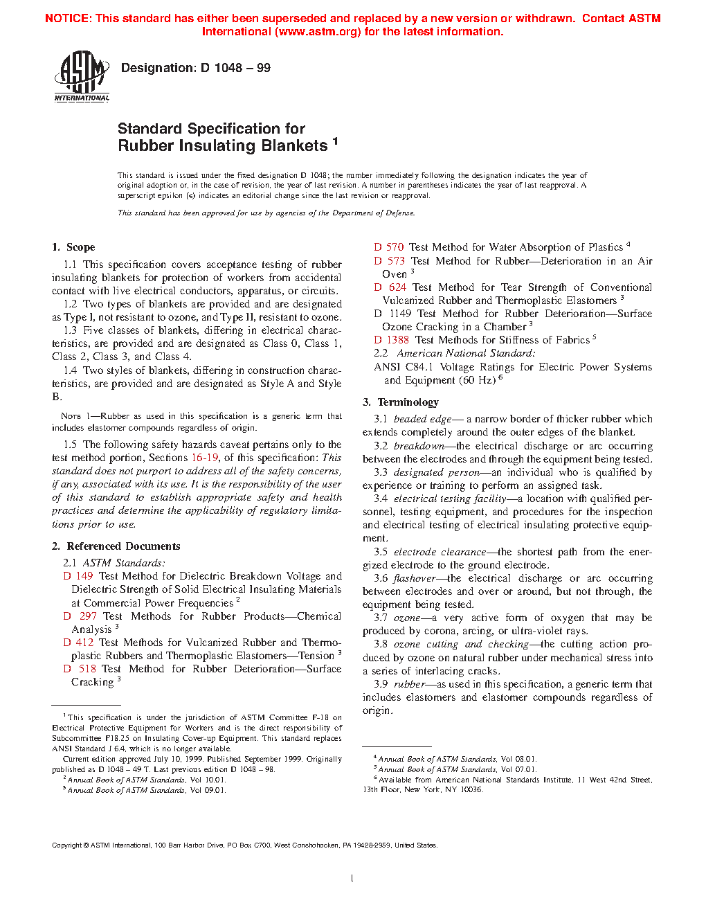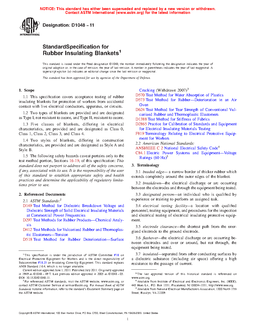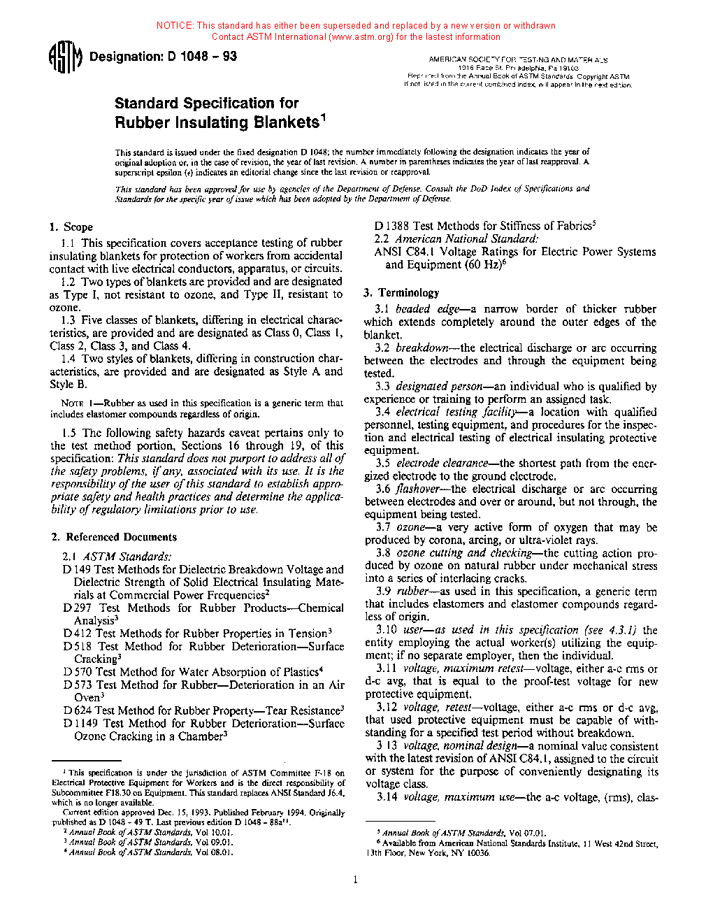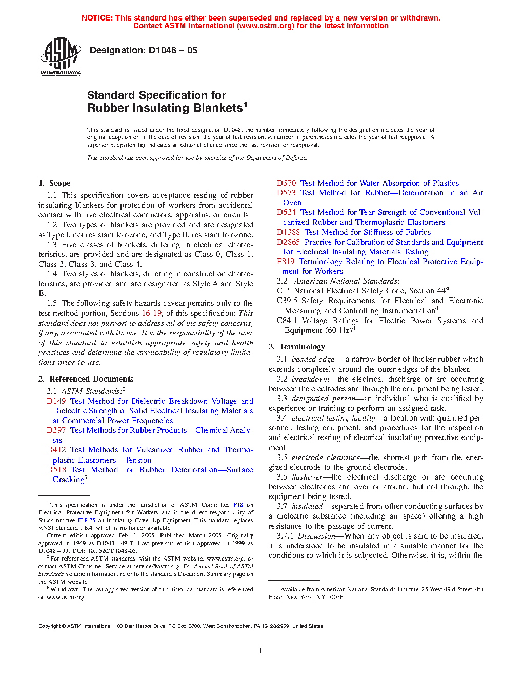 This specification covers the acceptance testing of insulating rubber blankets that are used for the personal protection of workers from accidental contact with live electrical conductors, apparatus, or circuits. Two types of blankets, differing in chemical and physical characteristics, are provided and are designated as: Type I, made from properly vulcanized high-grade cis-1,4-polyisoprene rubber compound of natural or synthetic origin that is non-resistant to ozone; and Type II, made of any elastomer or combination of elastomeric compounds that is resistant to ozone. Five classes of blankets, designated as Classes 0, 1, 2, 3, and 4, are assigned according to electrical protection characteristics. Styles of blankets are designated in accordance to construction characteristics, namely: Style A, blankets free of any reinforcements; and Style B, blankets incorporated with reinforcement(s). When evaluated in accordance with the test procedures detailed herein, the blankets shall adhere to the following property requirements: electrical properties such as phase-phase maximum use voltage, AC and DC proof-test voltages, AC and DC dielectric breakdown test voltages, and AC and DC clearances; and physical and chemical properties such as ozone resistance, moisture absorption, tensile strength, tension set, elongation, drape stiffness, flex stiffness, tear resistance, resistance to accelerated heat aging, and puncture resistance.