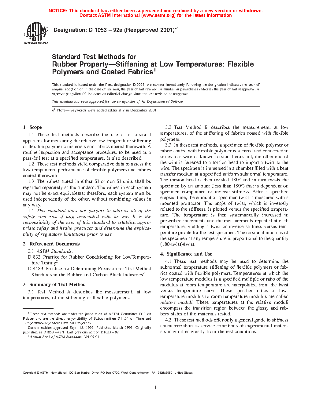 1.1 These test methods describe the use of a torsional apparatus for measuring the relative low temperature stiffening of flexible polymeric materials and fabrics coated therewith. A routine inspection and acceptance procedure, to be used as a pass-fail test at a specified temperature, is also described.