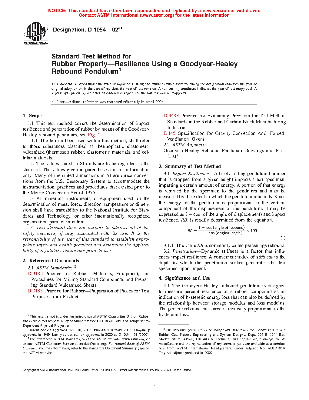 1.1 This test method covers the determination of impact resilience and penetration of rubber by means of the Goodyear-Healey rebound pendulum, see Fig. 1.