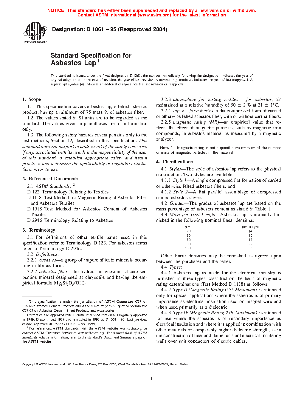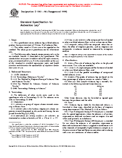 This specification establishes the properties of asbestos lap, a felted asbestos product, having a specified minimum mass % of asbestos fiber. Asbestos laps covered here are classified in two styles (Style 1 and 2) according to physical construction, five grades (Commercial, Underwriters', A, AA, AAA, and AAAA) according to mass percentage of asbestos content, and three types (Types II, IV, and VI) according to magnetic rating. Laps shall be made from a uniformly carded or otherwise felted blend of fibers. Specimens shall be sampled, prepared, tested, and conform accordingly to specified chemical composition (asbestos content), electromagnetic (magnetic rating), and dimensional (mass per unit length, and width) property requirements.