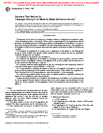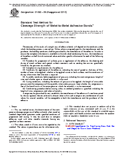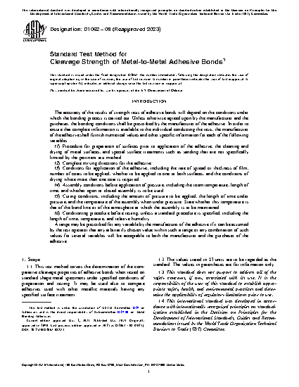 1.1 This test method covers the determination of the comparative cleavage properties of adhesive bonds when tested on standard shape metal specimens under specified conditions of preparation and testing. It may be used also to compare adhesives used with other metallic materials having any specified surface treatment.