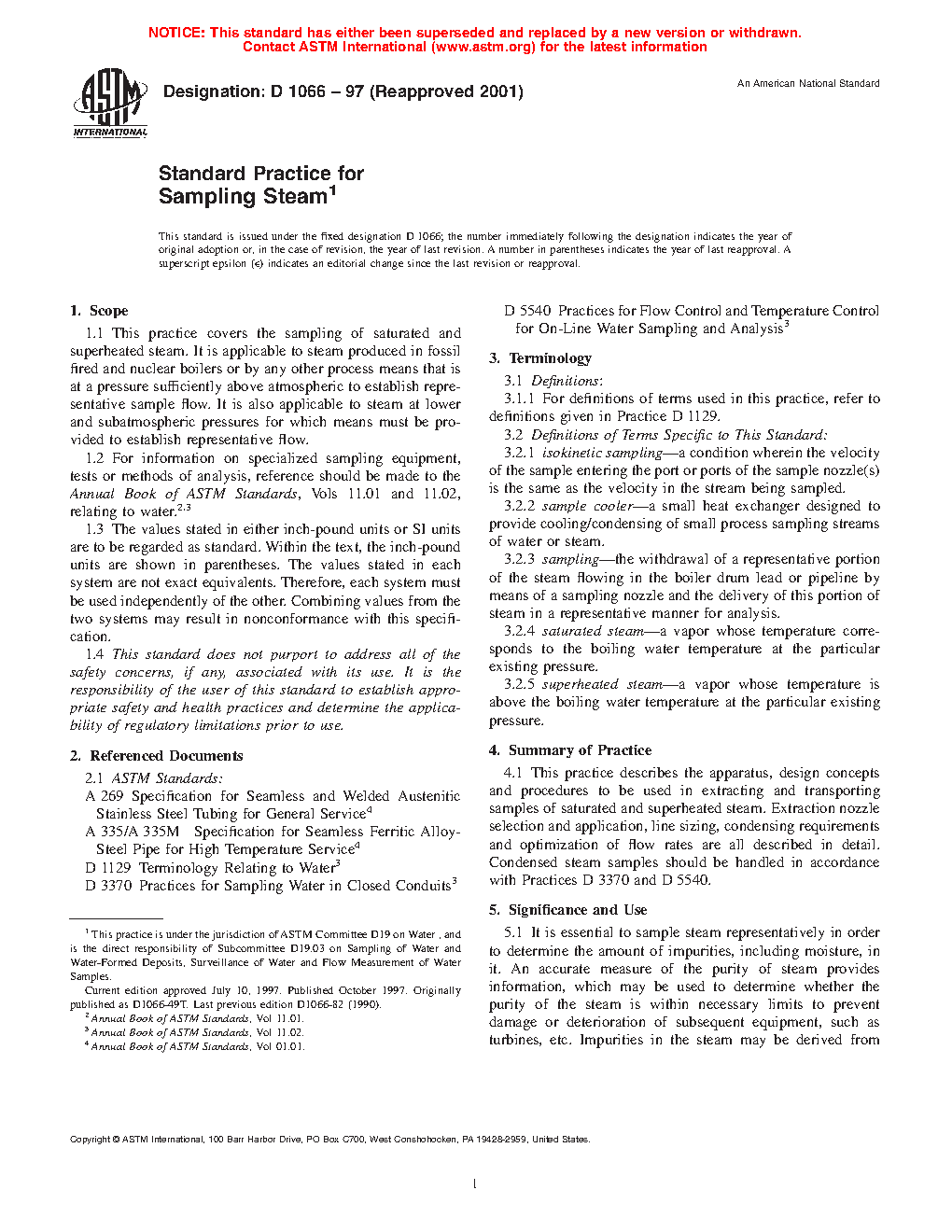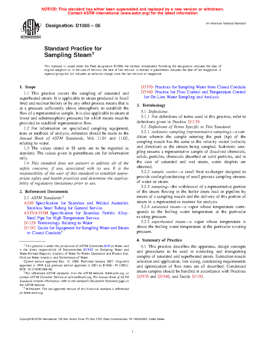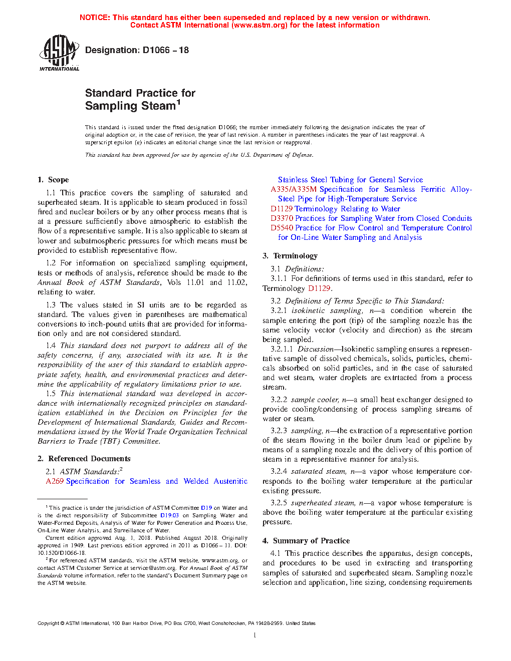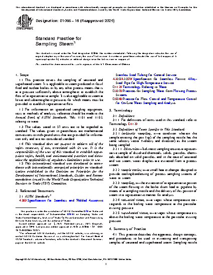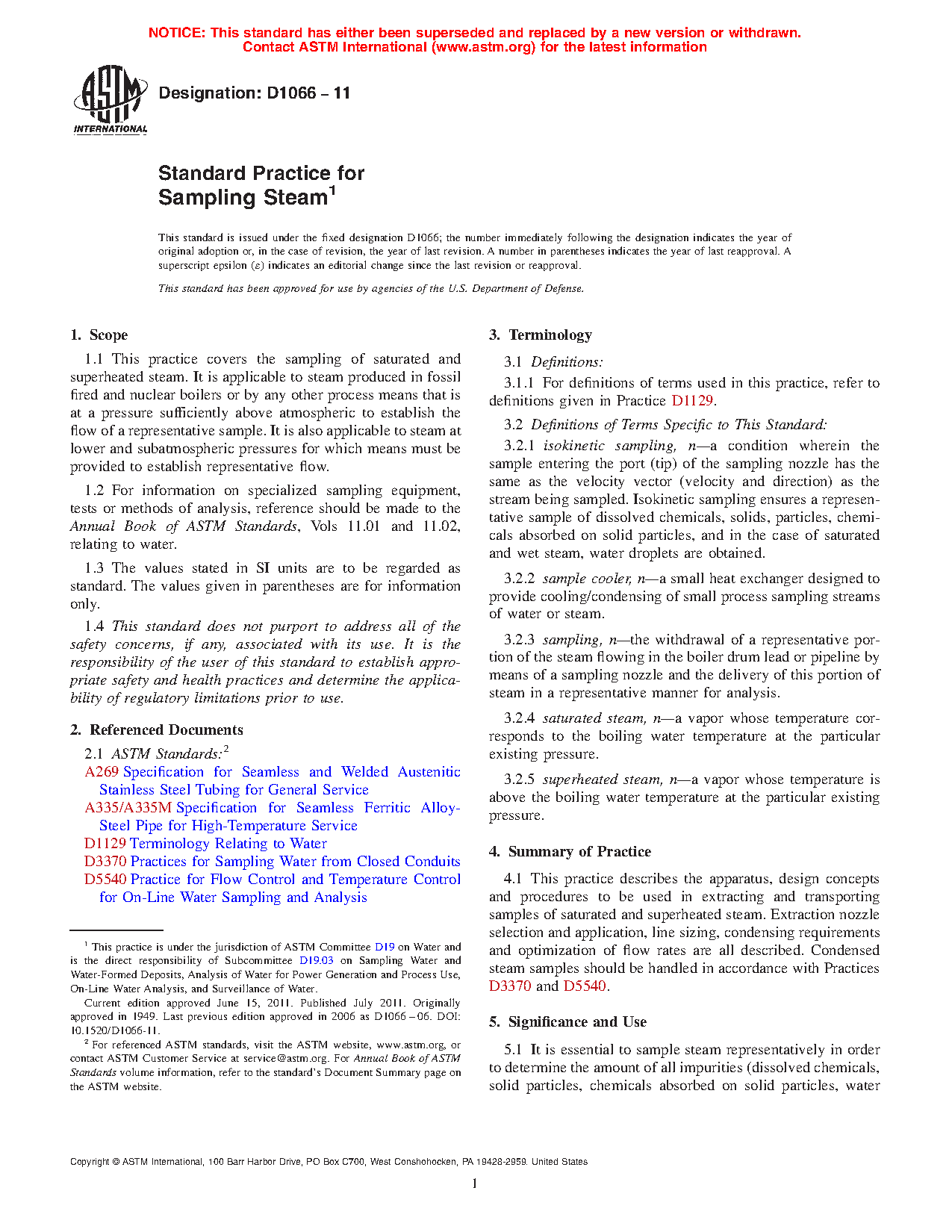 1.1 This practice covers the sampling of saturated and superheated steam. It is applicable to steam produced in fossil fired and nuclear boilers or by any other process means that is at a pressure sufficiently above atmospheric to establish the flow of a representative sample. It is also applicable to steam at lower and subatmospheric pressures for which means must be provided to establish representative flow.